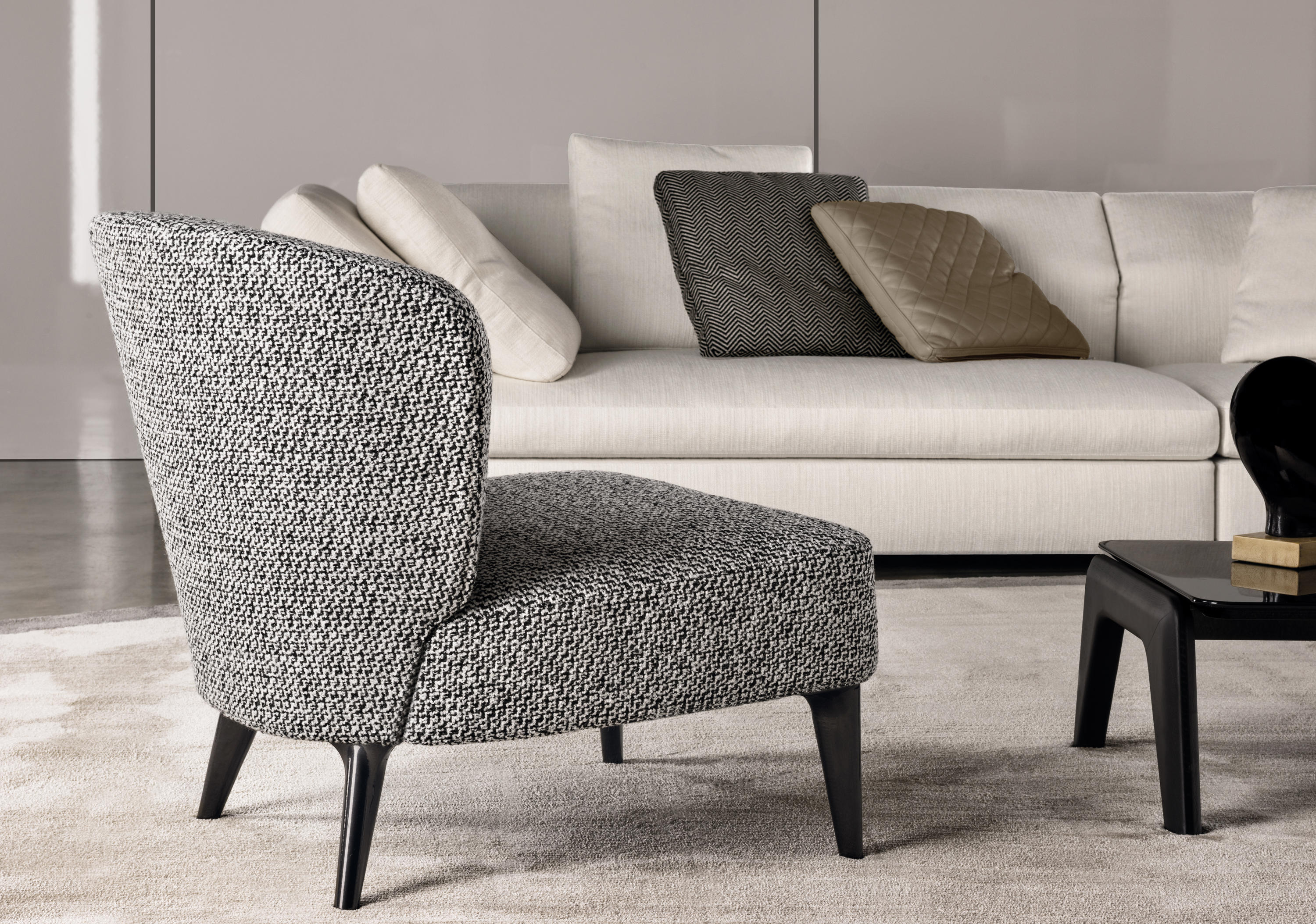 以精美梣木底座致敬传统黑檀木艺术,搭配拥有圆滑转角与柔和饰边的光泽漆面黑檀木、黑色脱蜡琉璃及 Marron Damasco 大理石台板。