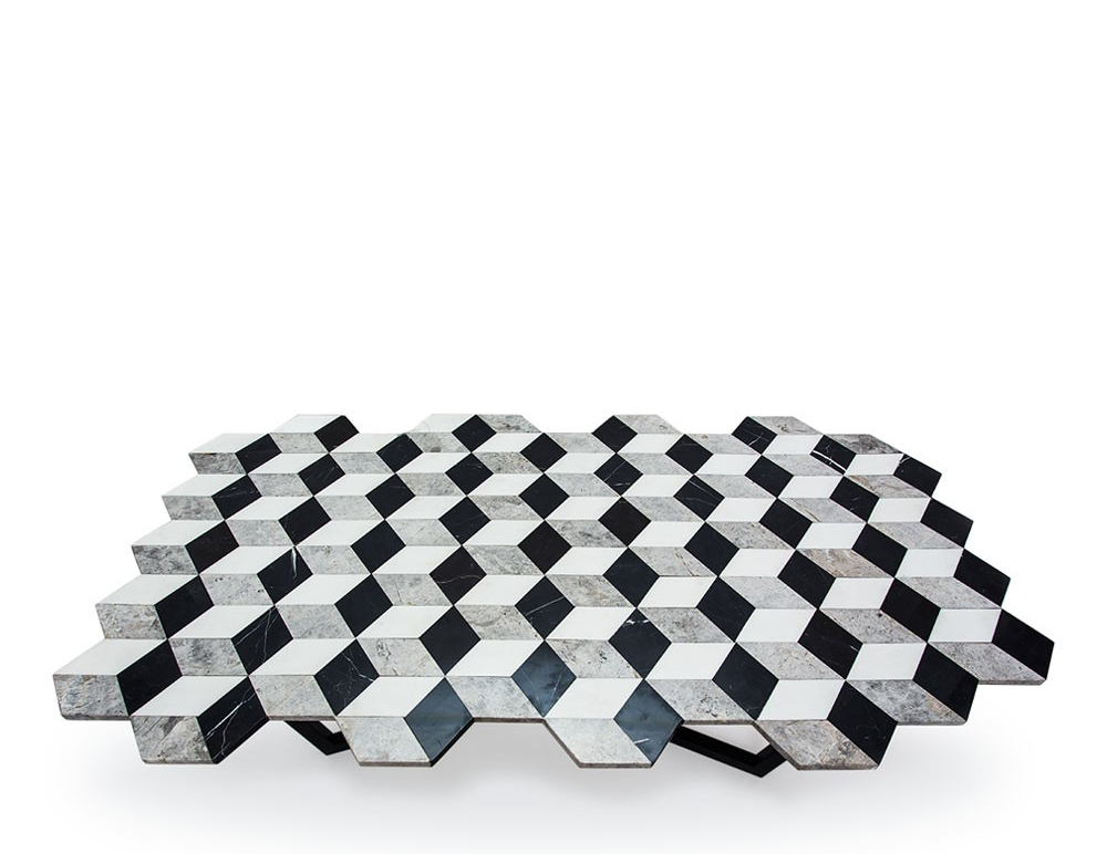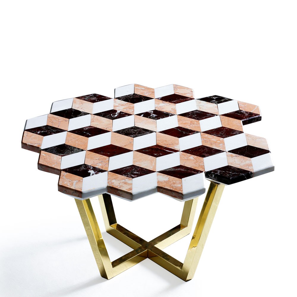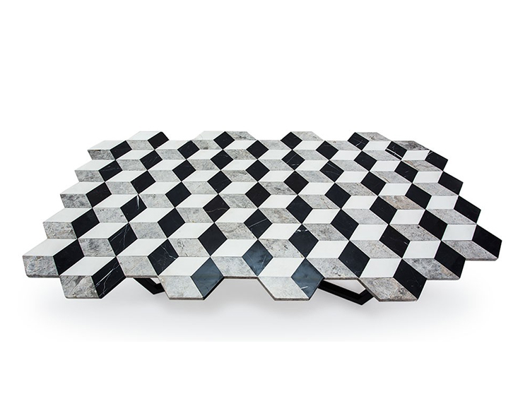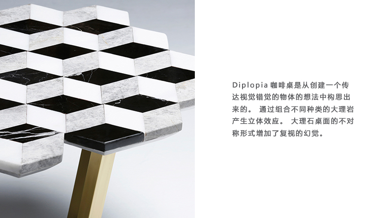 复视咖啡桌(Diplopia coffee table)是从创建一个传达视觉错觉的物体的想法中构思出来的。通过组合不同种类的大理岩产生立体效应。大理石桌面的不对称形式增加了复视的幻觉。复色的单色和彩色版本是用抛光或未抛光的铜腿制成的。更大的尺寸可根据要求提供。