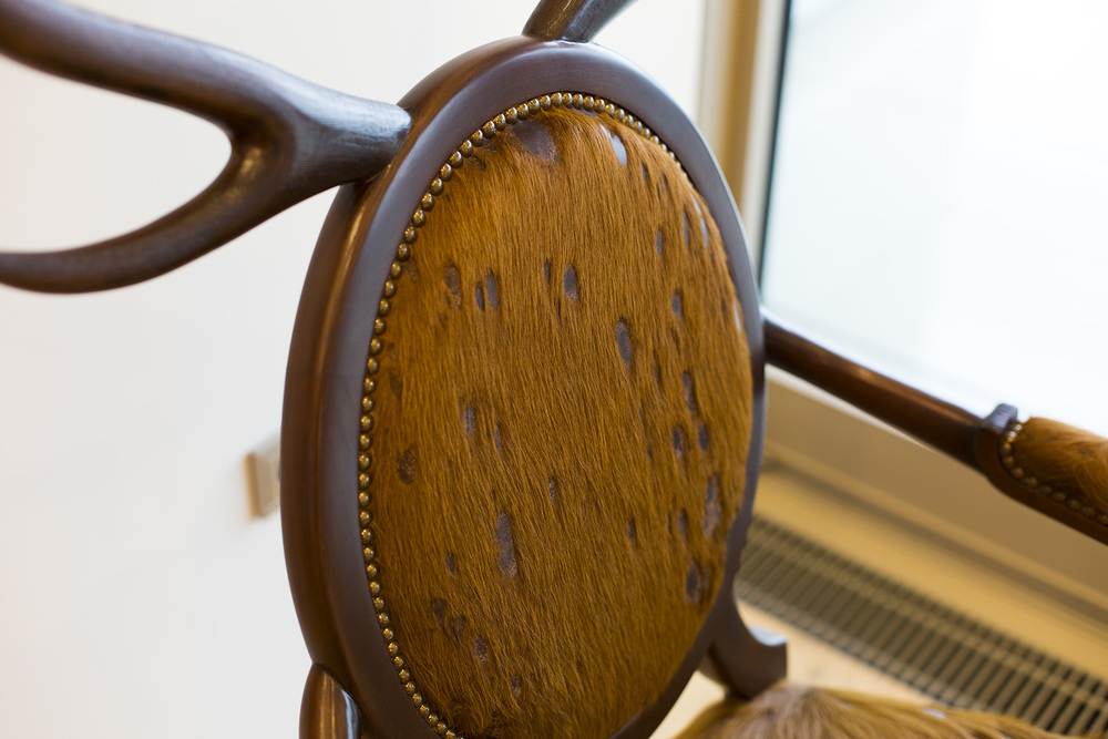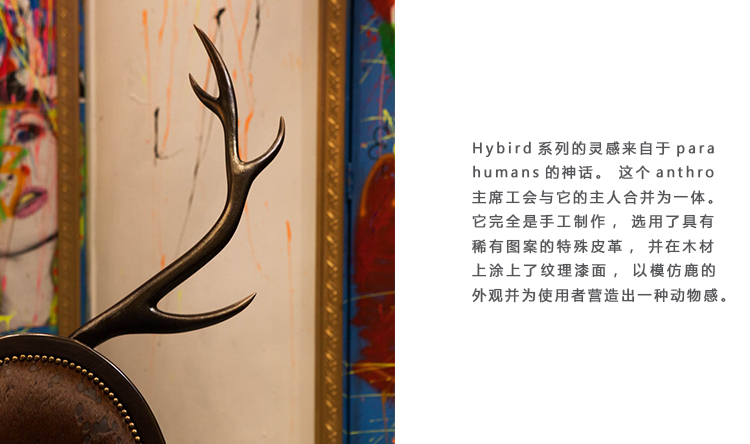 Hybrid系列的灵感来自于parahumans的神话。 这个anthro主席工会与它的主人合并为一体。 它完全是手工制作,选用了具有稀有图案的特殊皮革,并在木材上涂上了纹理漆面,以模仿鹿的外观并为使用者营造出一种动物感。