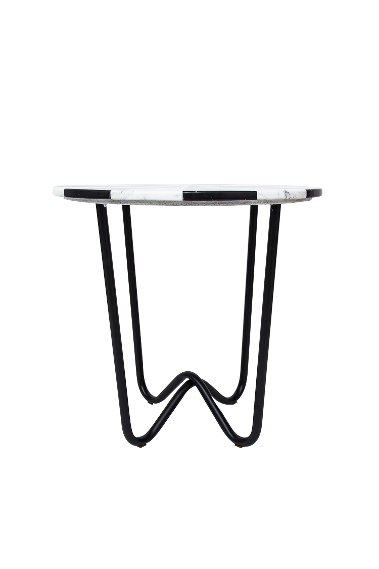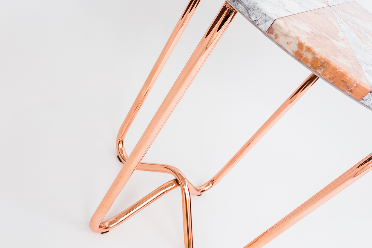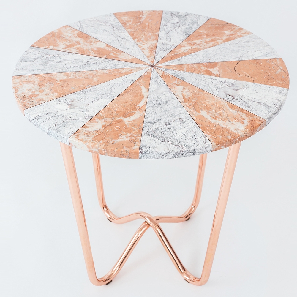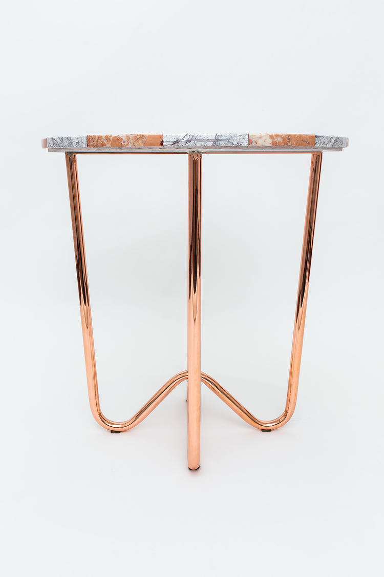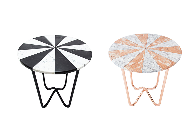 “Jasmine Pizza(茉莉花披萨)”结合了两种不同的大理石和对比鲜明的色彩,完全是手工制作,饰有弧形形铜腿。 “Jasmine Pizza”有不同的大理石,腿部饰面和尺码。