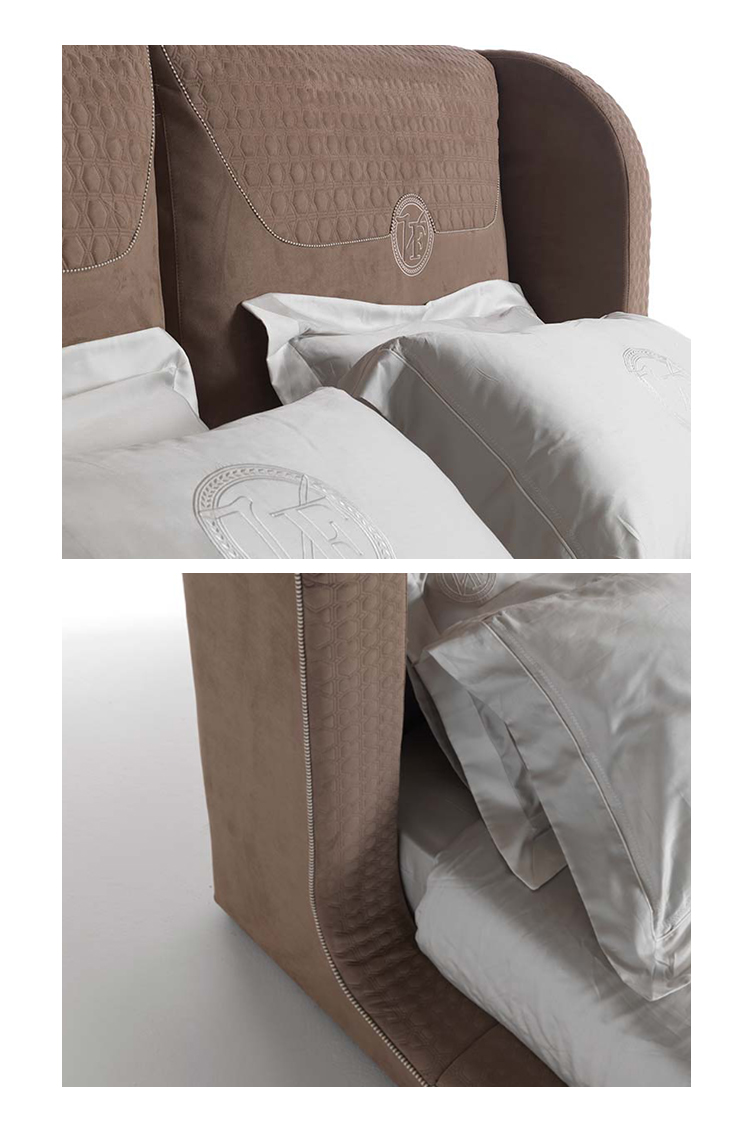 高床头和珍贵的刺绣充实简单的这张床光和现代设计的特征。