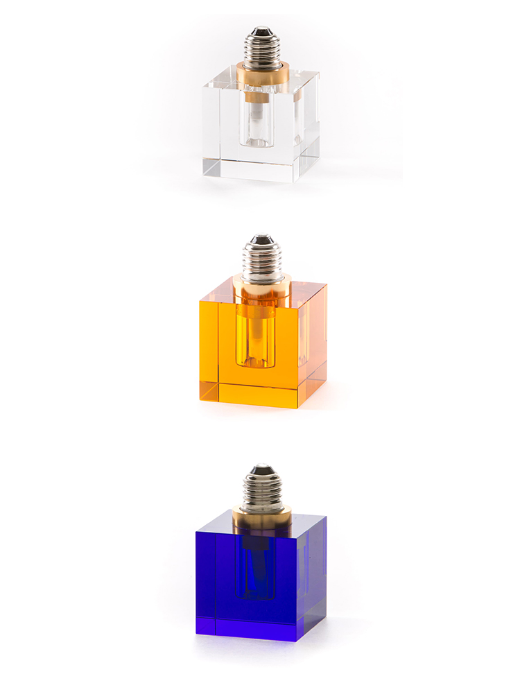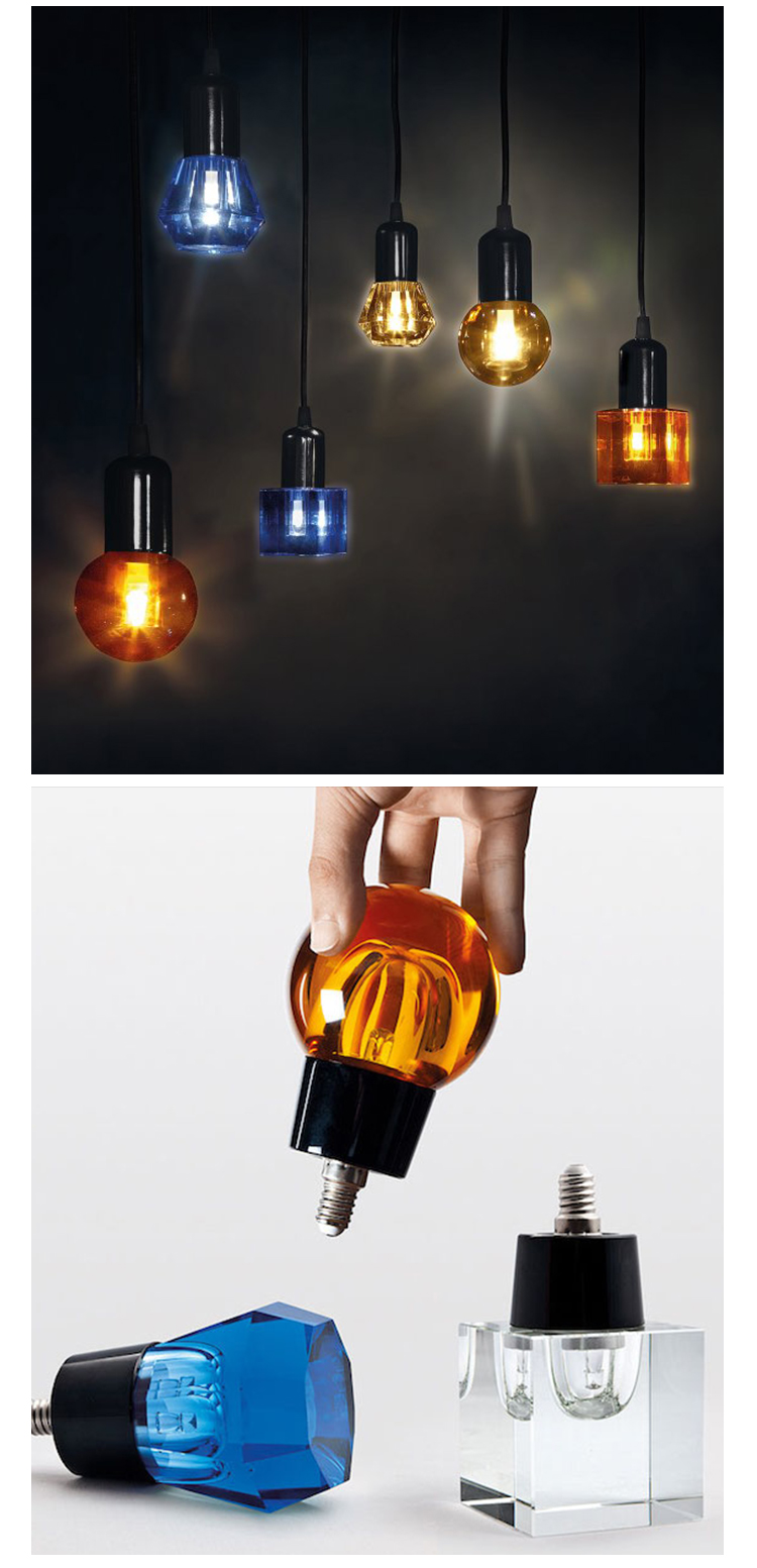 一个新的灯泡概念,在水晶,技术和复杂的透明度之间的对话,经过刻面手工处理.灯泡被重新解读为闪闪发光的宝石,三款灯泡由三种不同水晶形状和三种颜色组成.