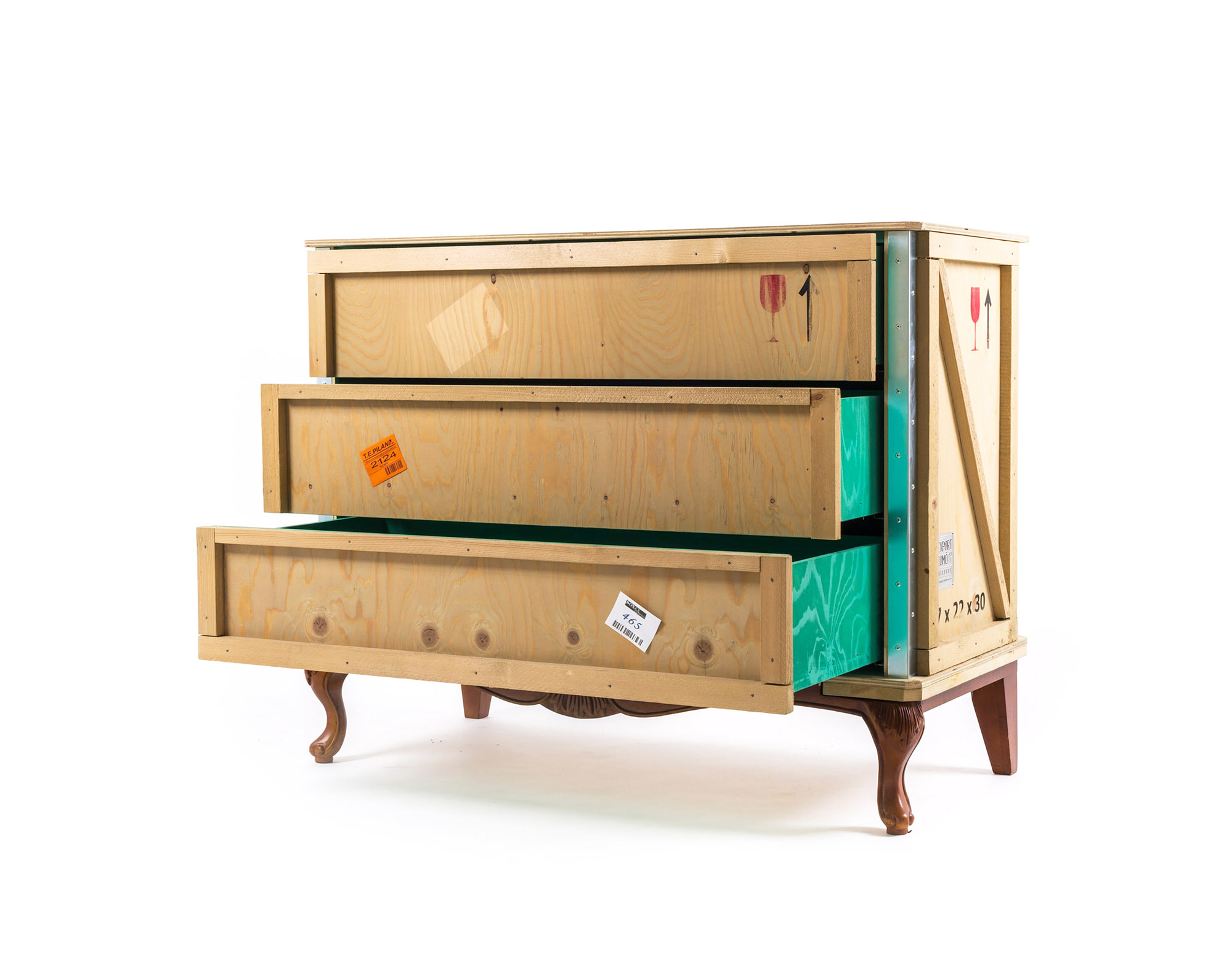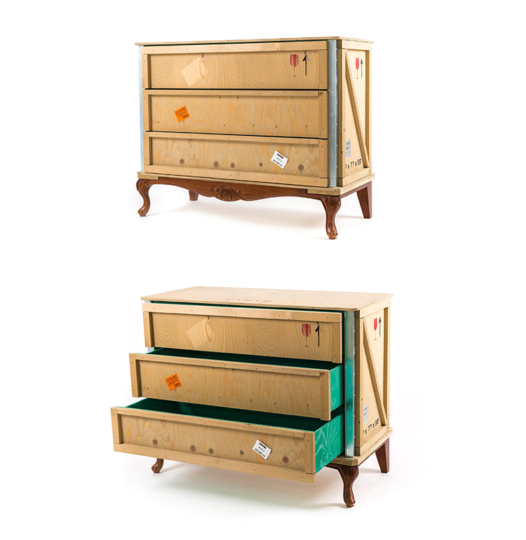 这款现代床头柜由Marcantonio Raimondi Malerba为Seletti设计,它融合了两种不同风格的设计。一个标有各种标签和标志的包装盒配上华丽的路易十四腿。明亮的绿色内部有一个架子和两个存储空间。手工制作的实木,这出口科莫床头柜是令人印象深刻的耐用性,因为它是在其独特的设计。它可以单独使用,在卧室或与来自ExportComo系列的其他家具一起创建一个焦点。意大利制造。