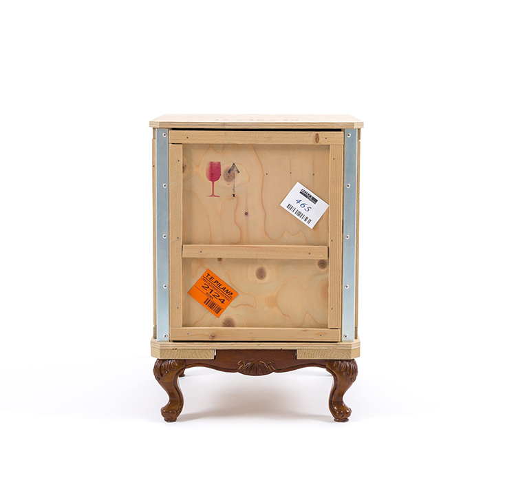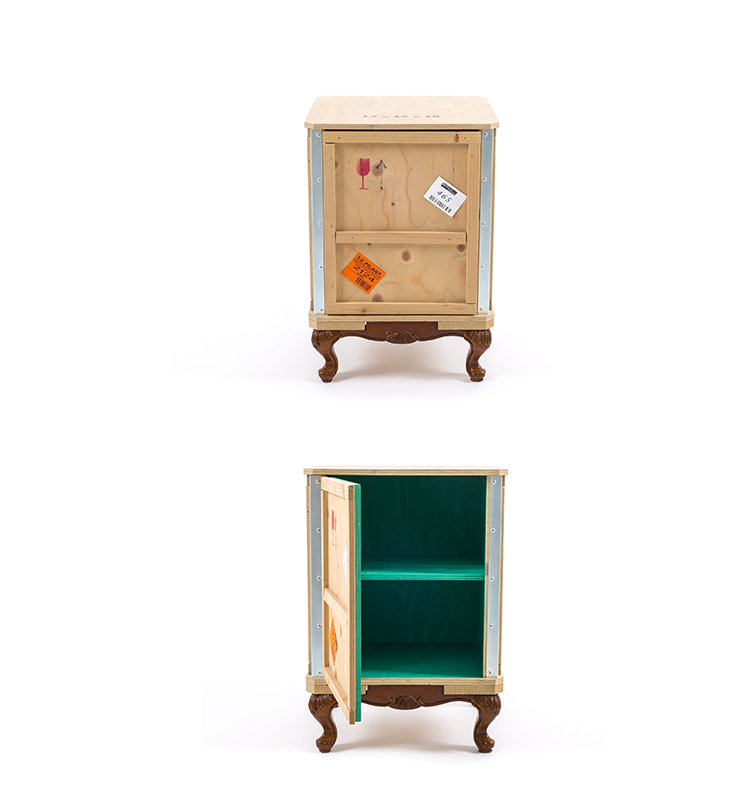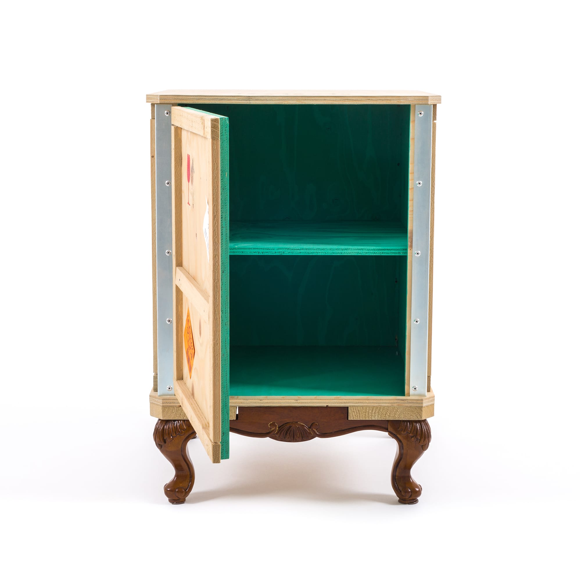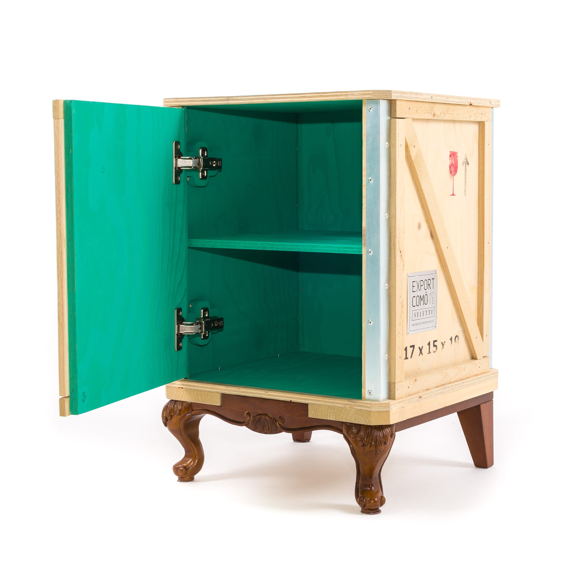 Designed by Marcantonio Raimondi Malerba for Seletti, this modern bedside table blends two different styles in one quirky design. A packing case boasting various labels and signs is paired with ornate Louis XIV legs. The bright green interior features one shelf and two storage spaces. Handmade from solid wood, this Export Como Bedside Table is as impressive in its durability as it is in its distinctive design. It can be used on its own to create a focal point in a bedroom or alongside other pieces of furniture from the Export Como collection. Made in Italy.