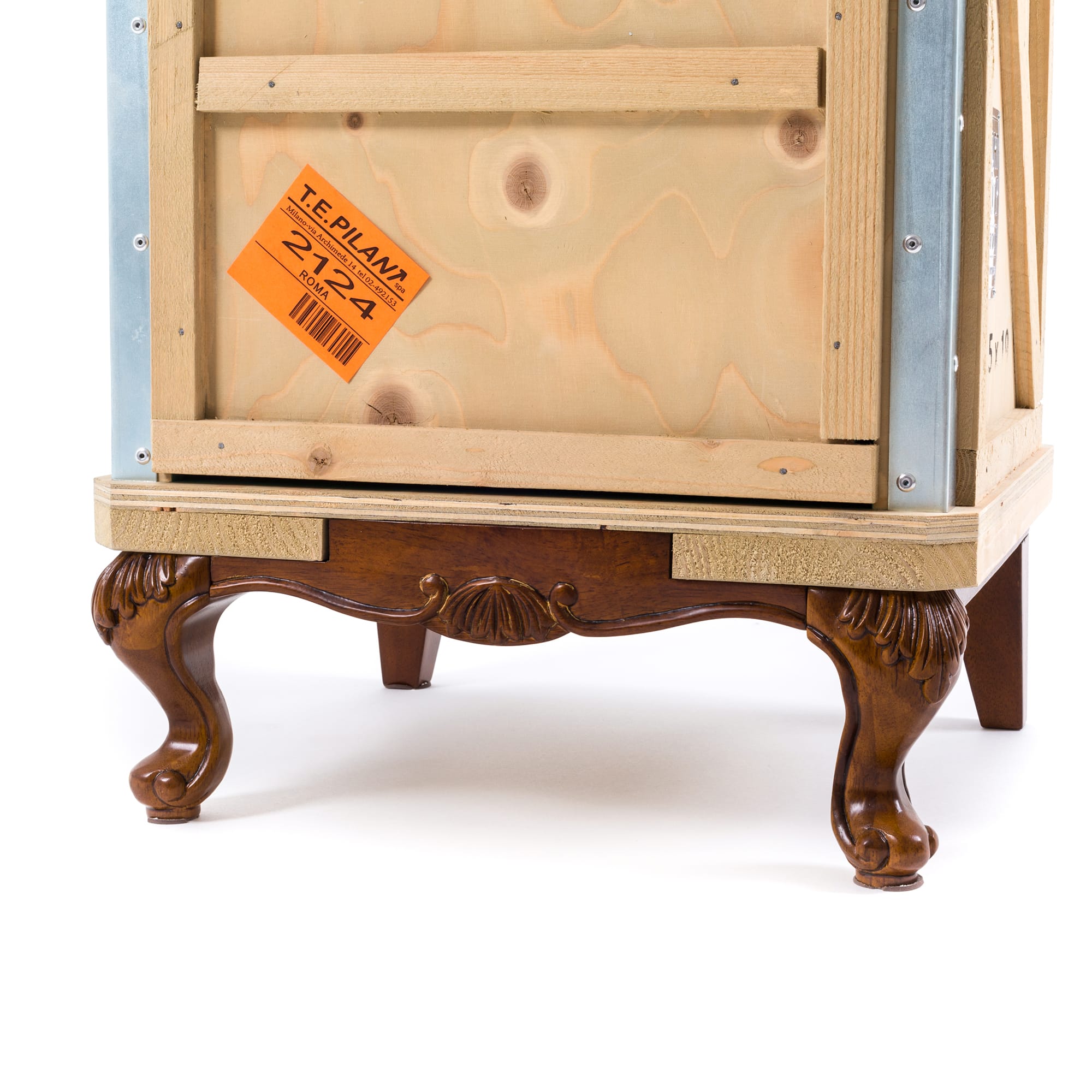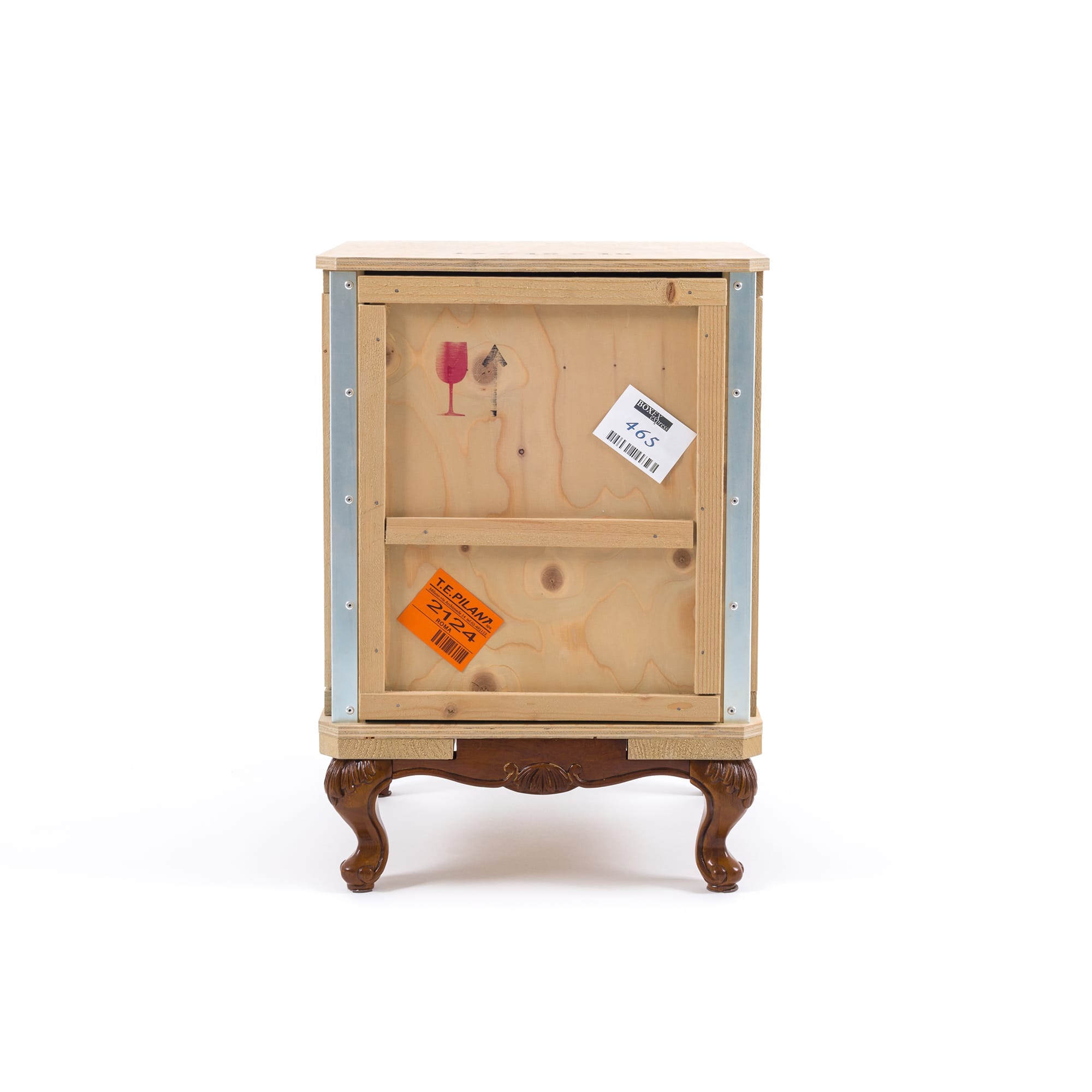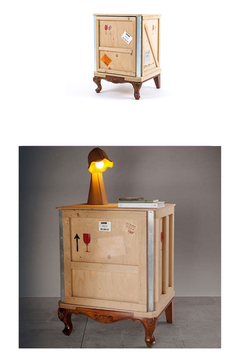 Designed by Marcantonio Raimondi Malerba for Seletti, this modern bedside table blends two different styles in one quirky design. A packing case boasting various labels and signs is paired with ornate Louis XIV legs. The bright green interior features one shelf and two storage spaces. Handmade from solid wood, this Export Como Bedside Table is as impressive in its durability as it is in its distinctive design. It can be used on its own to create a focal point in a bedroom or alongside other pieces of furniture from the Export Como collection. Made in Italy.