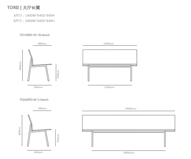 TORII | 大厅长凳 系列尺寸/示意图