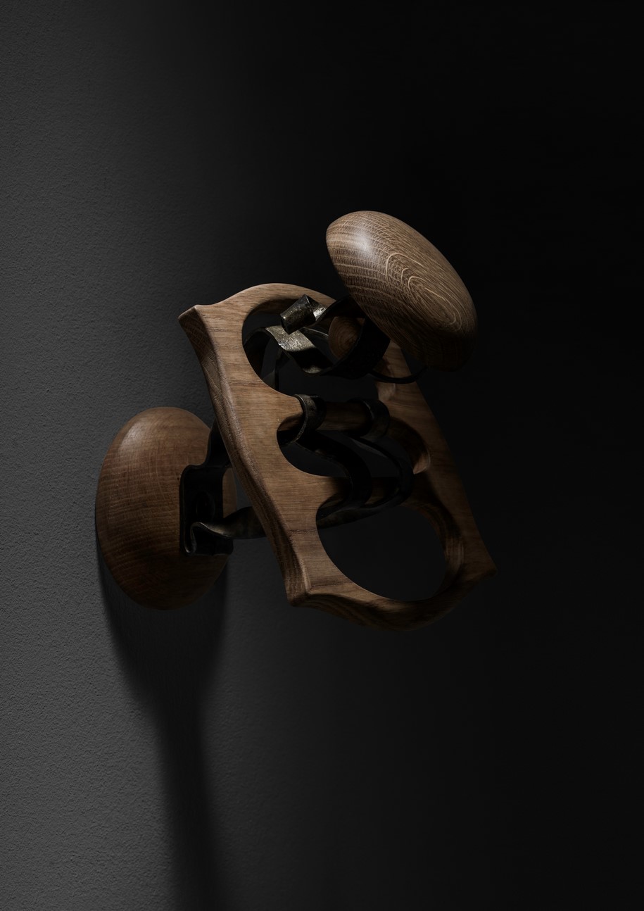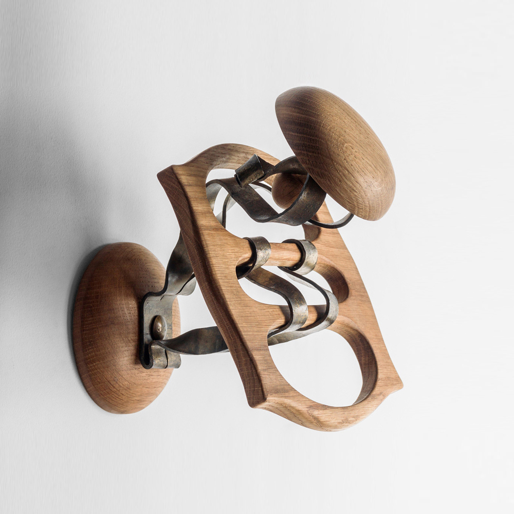 具有弯曲边缘的中央矩形木制主体。由三个细长开口交叉的表面,在中间与两个镀黄铜的钢带连接在一起,另外两个也是木质的。用圆形固定在一起,一个是周向支撑,另一个是正确的称呼,是衣架。其他配件也可以悬挂在中央部件的杆上,例如围巾和雨伞。