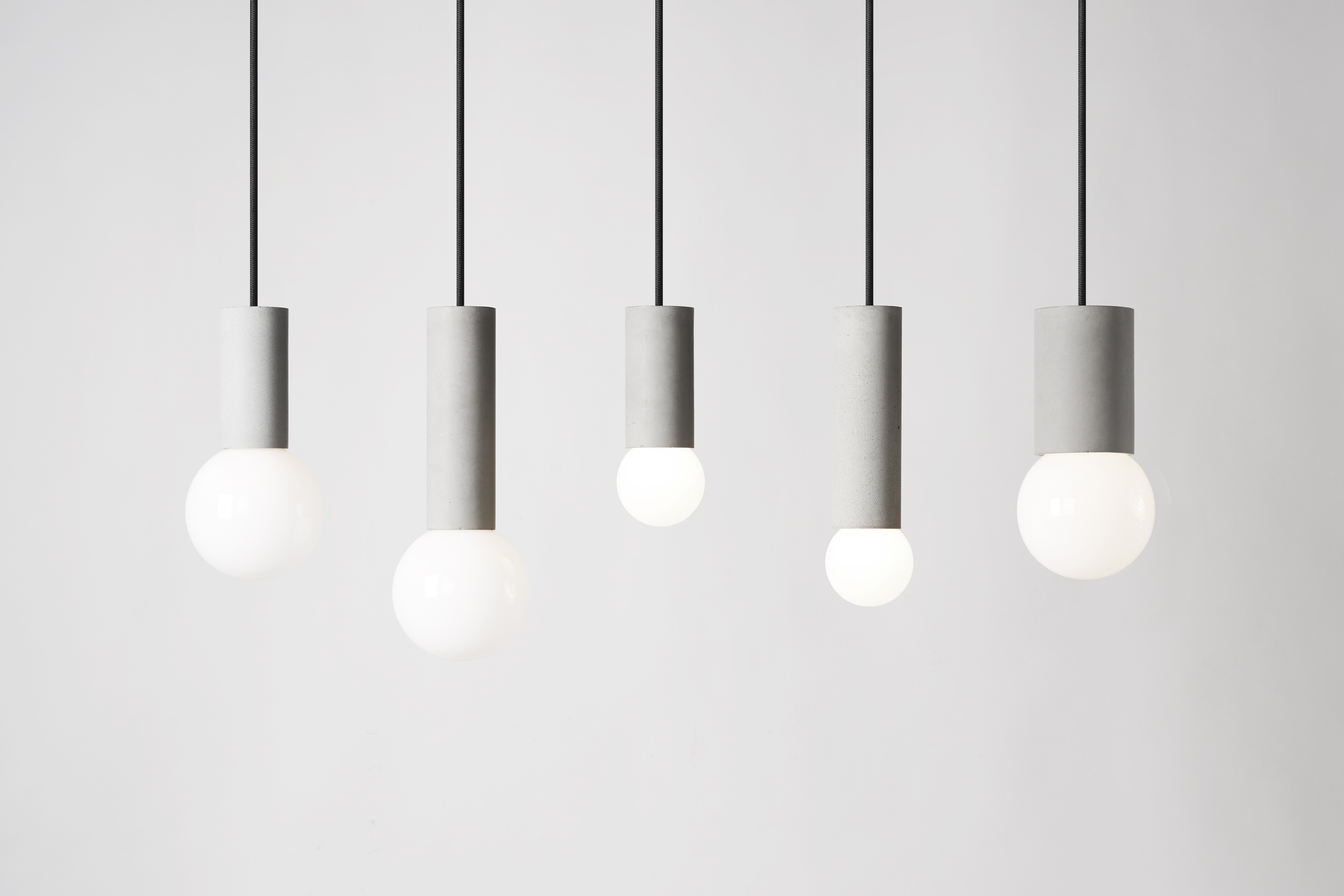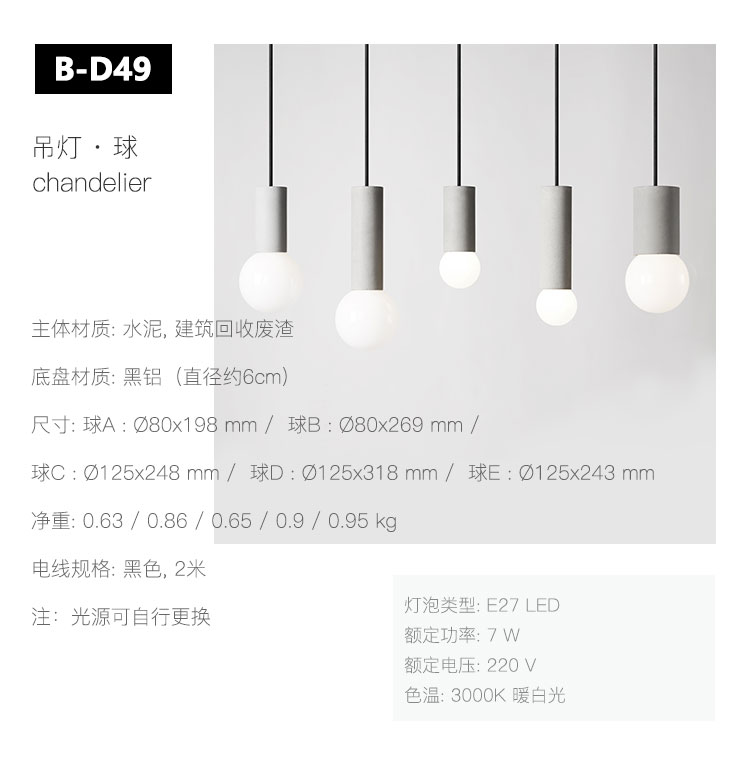 球系列吊灯 —— 回归设计上的纯粹干净和对细节的追求,细腻的清水混凝土孔洞肌理和极简的外型赋予这类常见的商业空间用灯独特的艺术品气质。 五个灯身尺寸皆可适配E27接口的不同规格灯泡,方便用户自行更换。 建议使用环境:适用于室内中心区域装饰,如沙发区域/大型餐桌区域/天花较高区域。至少2~3个成组会比较有效果。