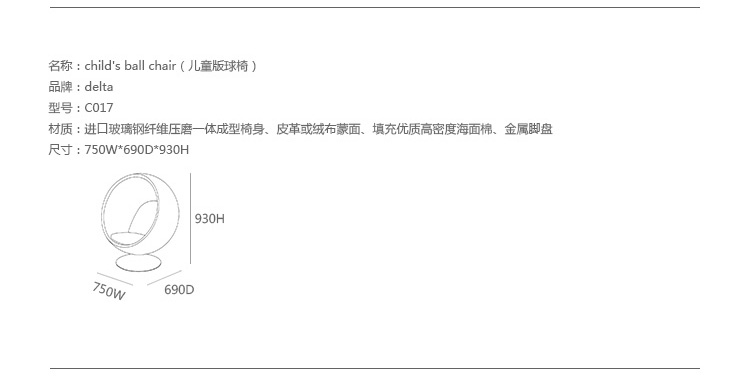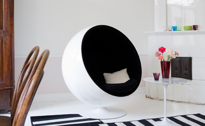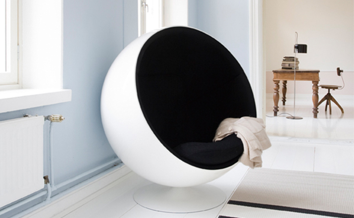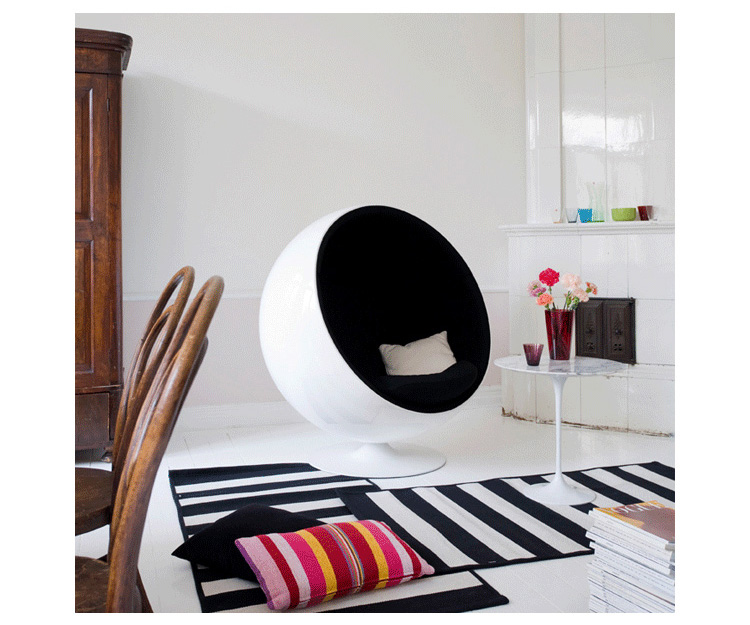 设计师艾洛·阿尼奥在 1963 年设计的,球椅结构简单,上边是用半球,下面是旋转的支撑脚,球椅(Ball Chair)球椅可以360度旋转。可以附加带喇叭MP3,香水味,彩光灯等功能,这种设计让消费者有眼前一亮的感觉,这设计也为家具厂商带来了一次巨大的商机,所以球椅(Ball Chair)也开始被大量的生产,它的诞生来家具设计提升了一个高度,让设计者重新审视了自己的设计观念。
