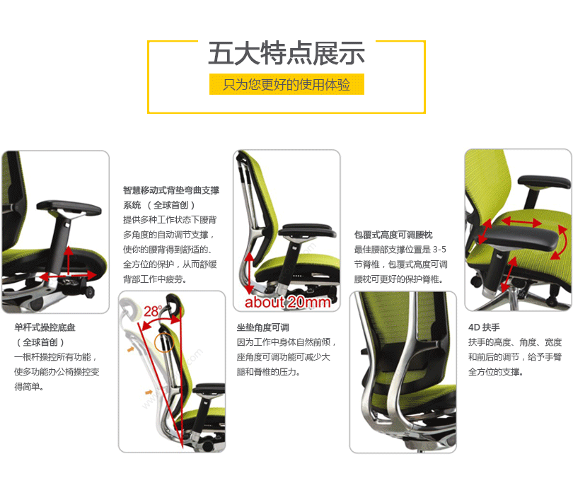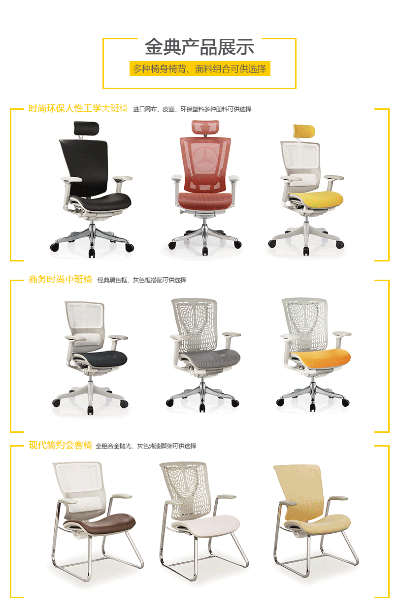 金典系列产品灵活度高,外观设计时尚,通过单杆操控多功能调整系统,使操控简便更人性化。优良的设计及精湛的力学与工学设计概念与一身,金典系列产品设计居于办公座椅行业前列,智慧移动腰背支撑系统,你怎么动他就怎么动。