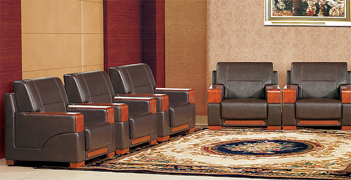 ※ 接待沙发的使用场景展示图,实木扶手,倾斜的椅背,表面材质皮革,便于清洁,厚实稳重,正式型的接待区!
