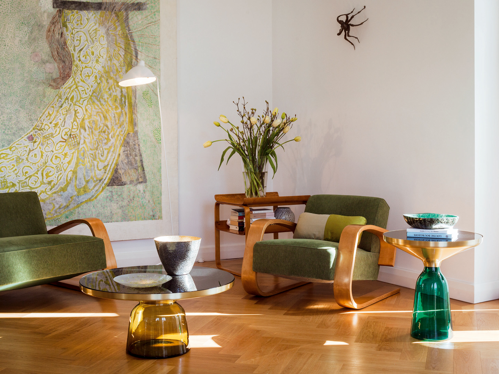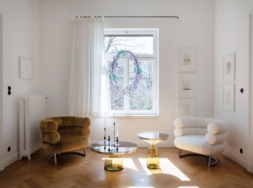 透明的有色玻璃雕塑,与黄铜框架形成有趣的对比,也与它形成一个和谐的优雅曲线轮廓