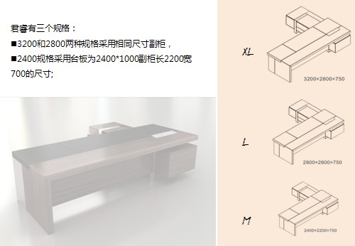 ※温馨提示: 君睿配套系列大班台 CG-JRQ3268的图片颜色已尽量接近实物,但因为拍摄时的光线、显示器的分辨率不同等因素,君睿配套系列大班台 CG-JRQ3268会存在一定的色差,请您谅解。