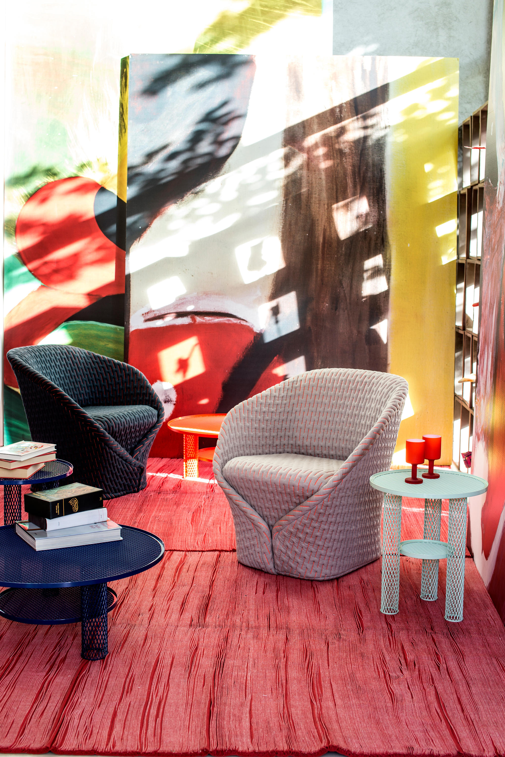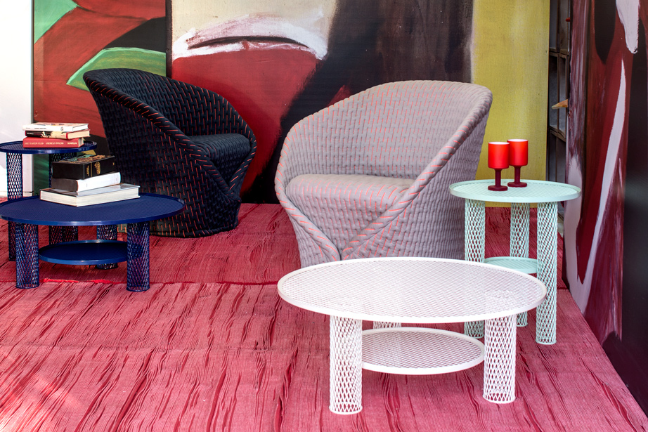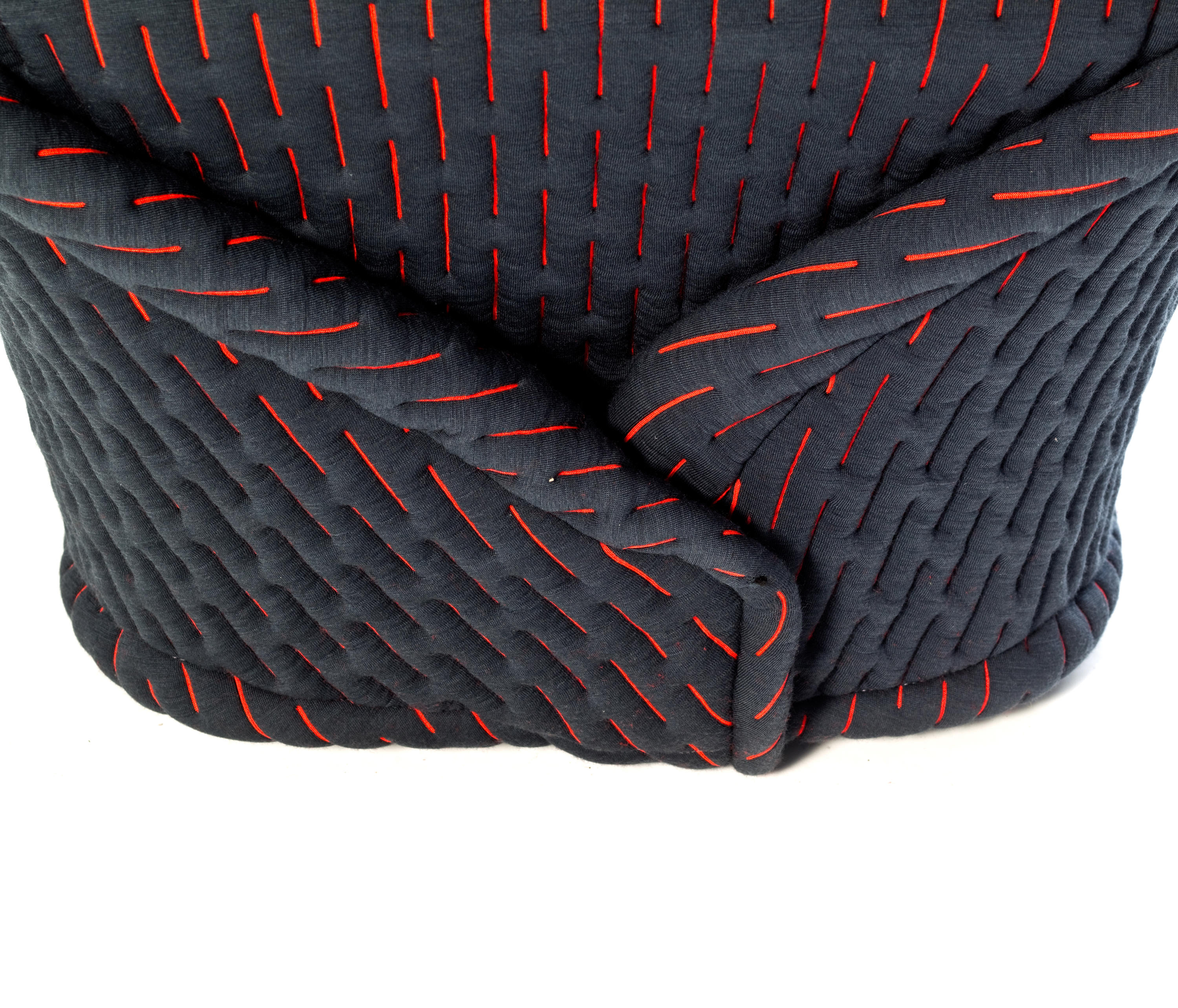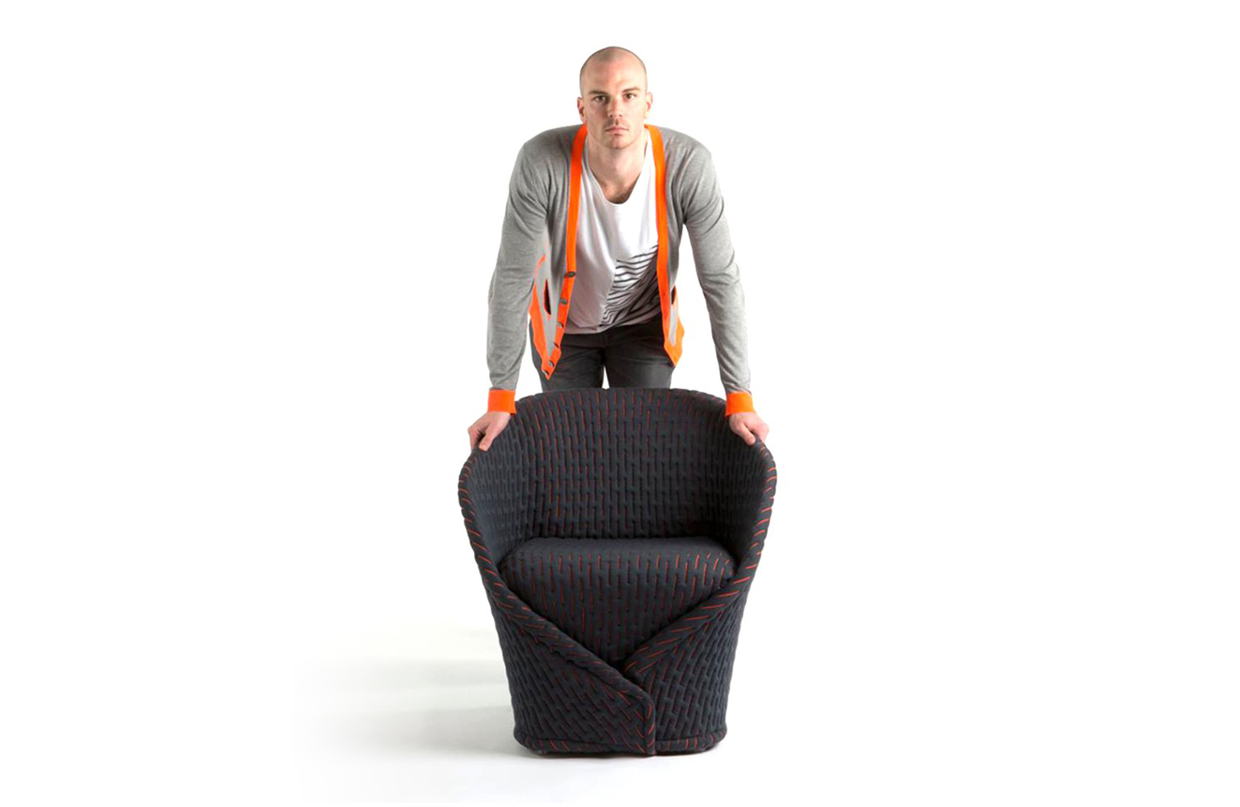 伪装成休闲椅的扶手椅,用他们的外表来控制空间。这主意很简单,用一件有衬垫的大衣盖住金属框架然后把它变成别的东西。一种非常直立的姿势,扶手的形状让人联想到双排扣外套的翻领,而这种相似之处就在中央扣扣上。室内装潢变成了衣服,可以在不过度的情况下,将赤裸的身体转变成一种追求自身内在同一性的物体。