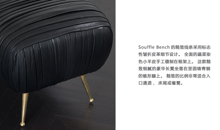 Souffle Bench的精致线条采用标志性皱折皮革细节设计。 全面的蔬菜染色小羊皮手工缝制在框架上。 这款精致细腻的豪华长凳坐落在坚固铸青铜的锥形腿上。 精致的比例非常适合入口通道,床尾或餐凳。