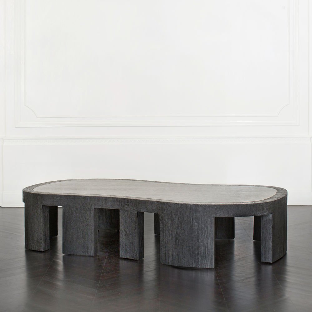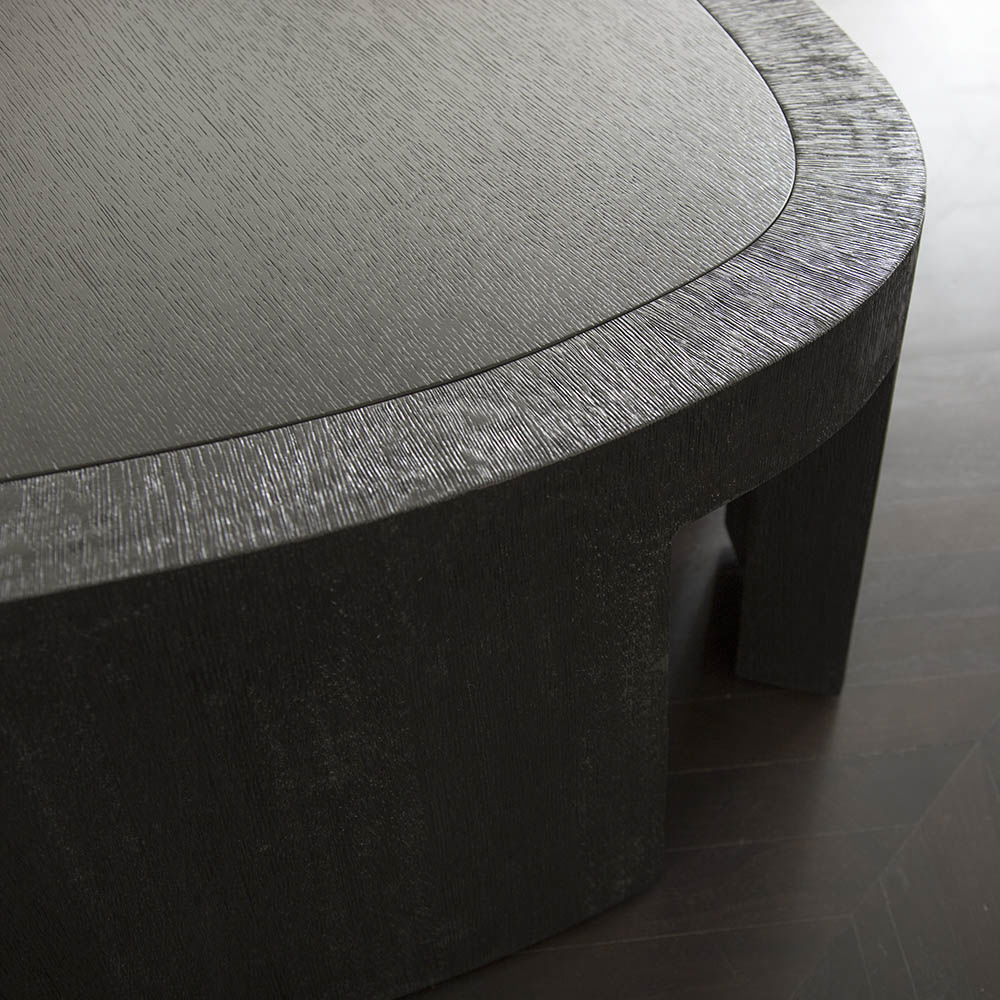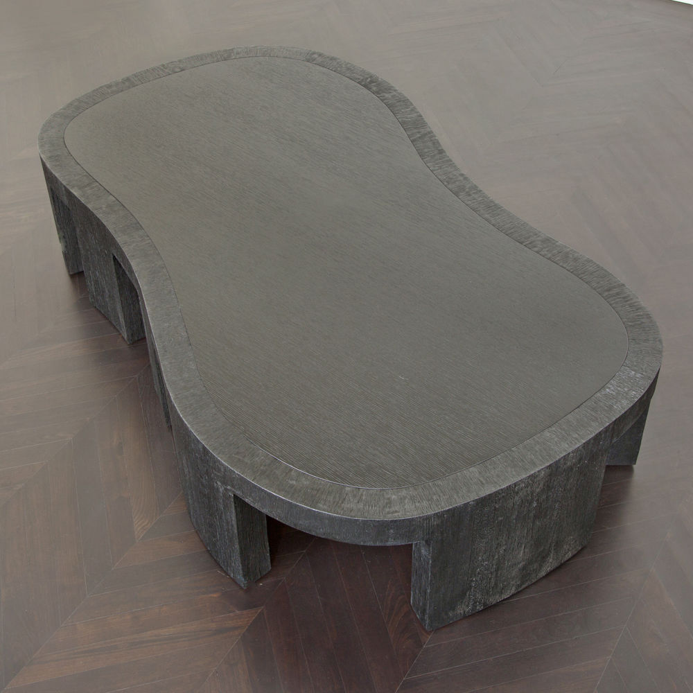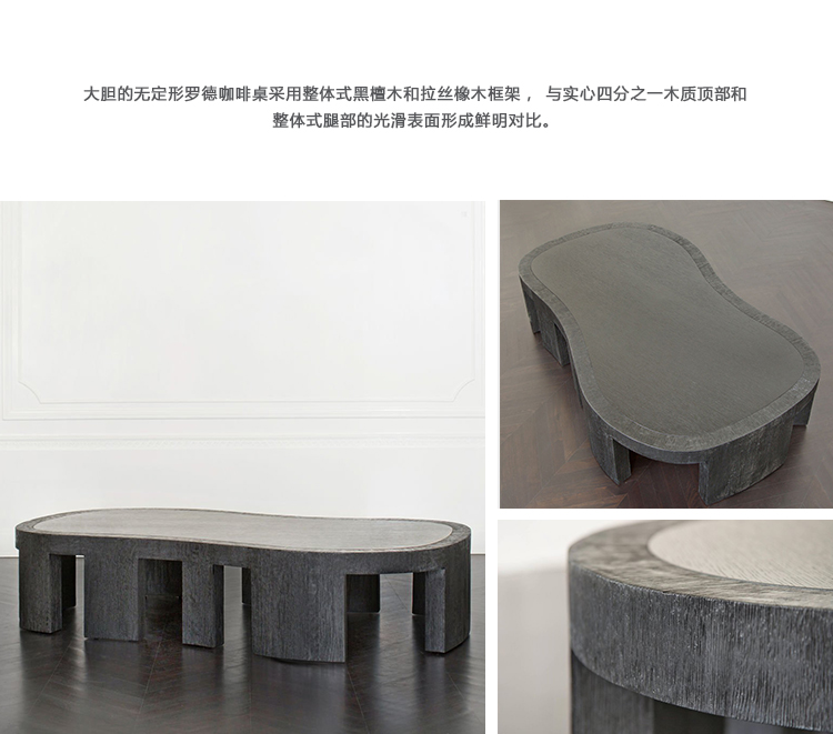 大胆的无定形罗德咖啡桌采用整体式黑檀木和拉丝橡木框架,与实心四分之一木质顶部和整体式腿部的光滑表面形成鲜明对比。