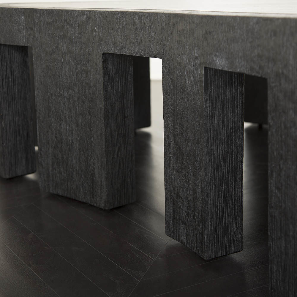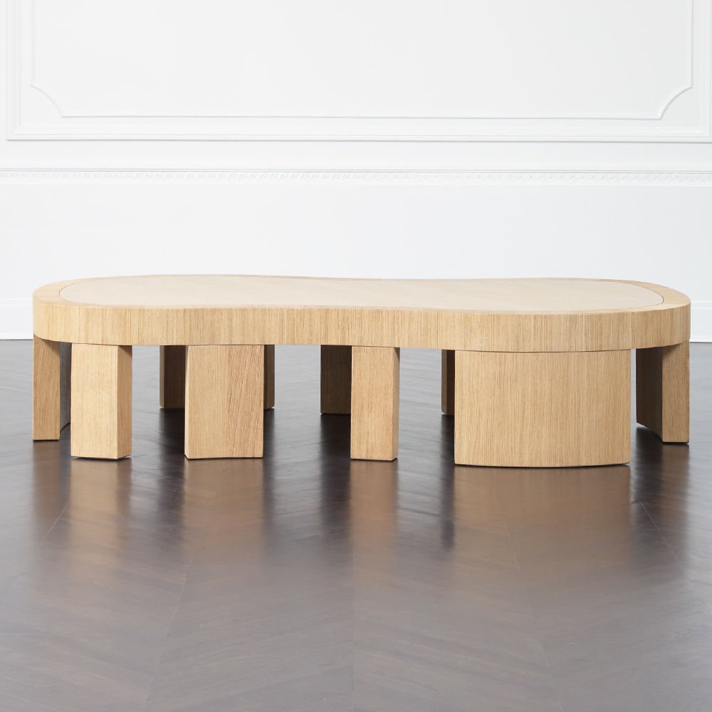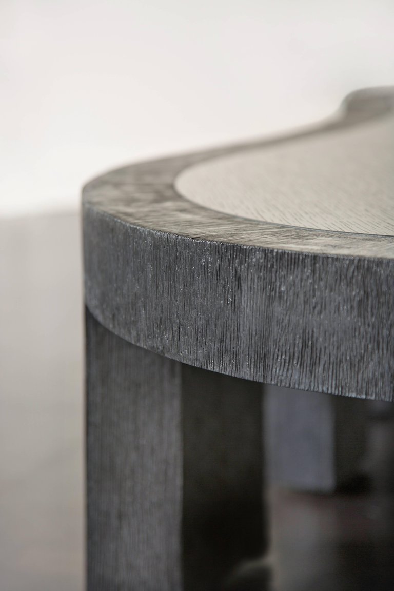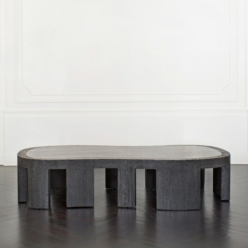大胆的无定形罗德咖啡桌采用整体式黑檀木和拉丝橡木框架,与实心四分之一木质顶部和整体式腿部的光滑表面形成鲜明对比。