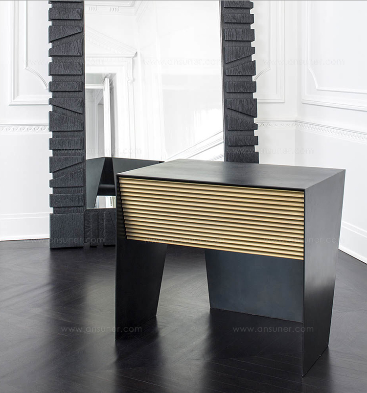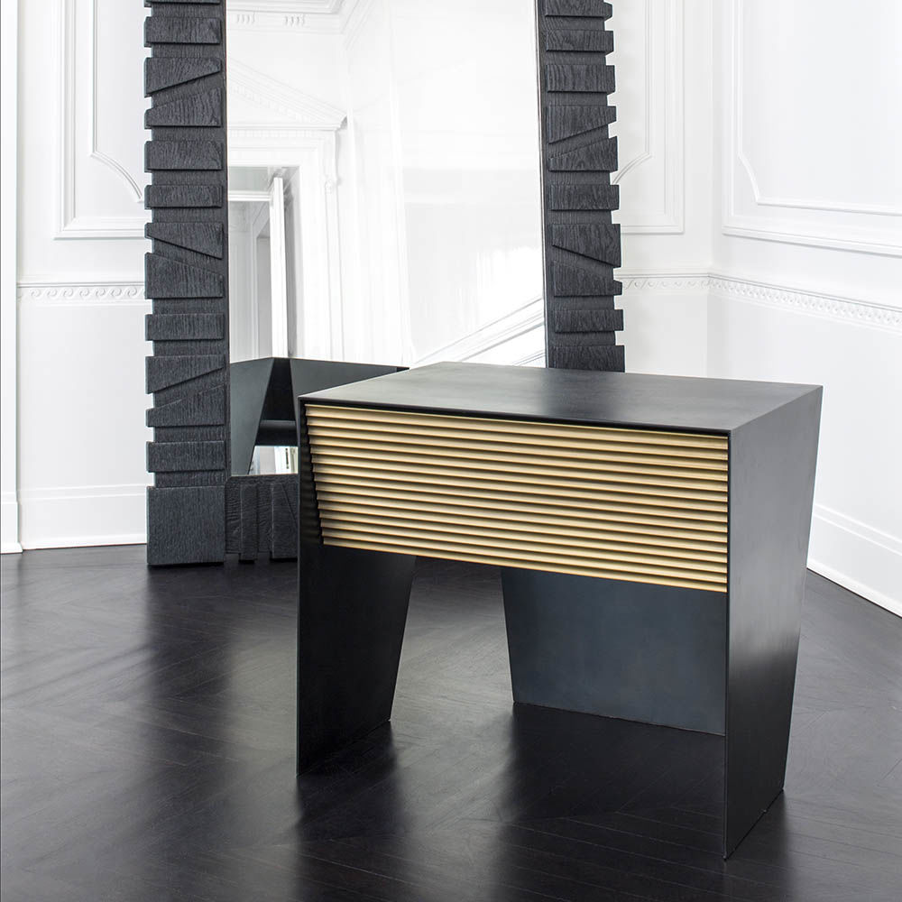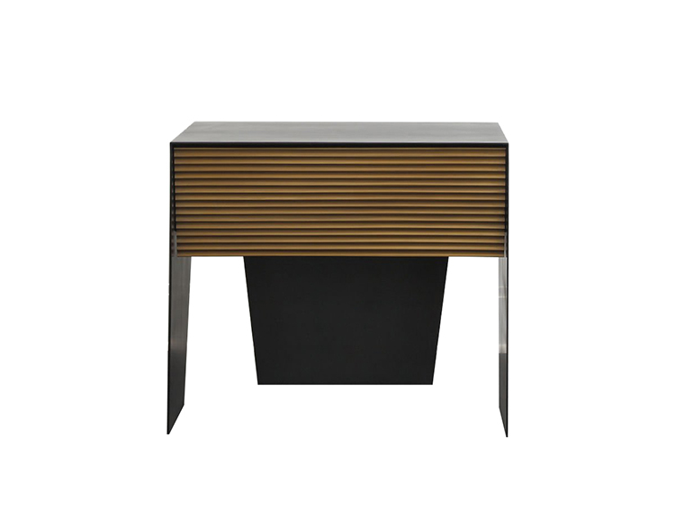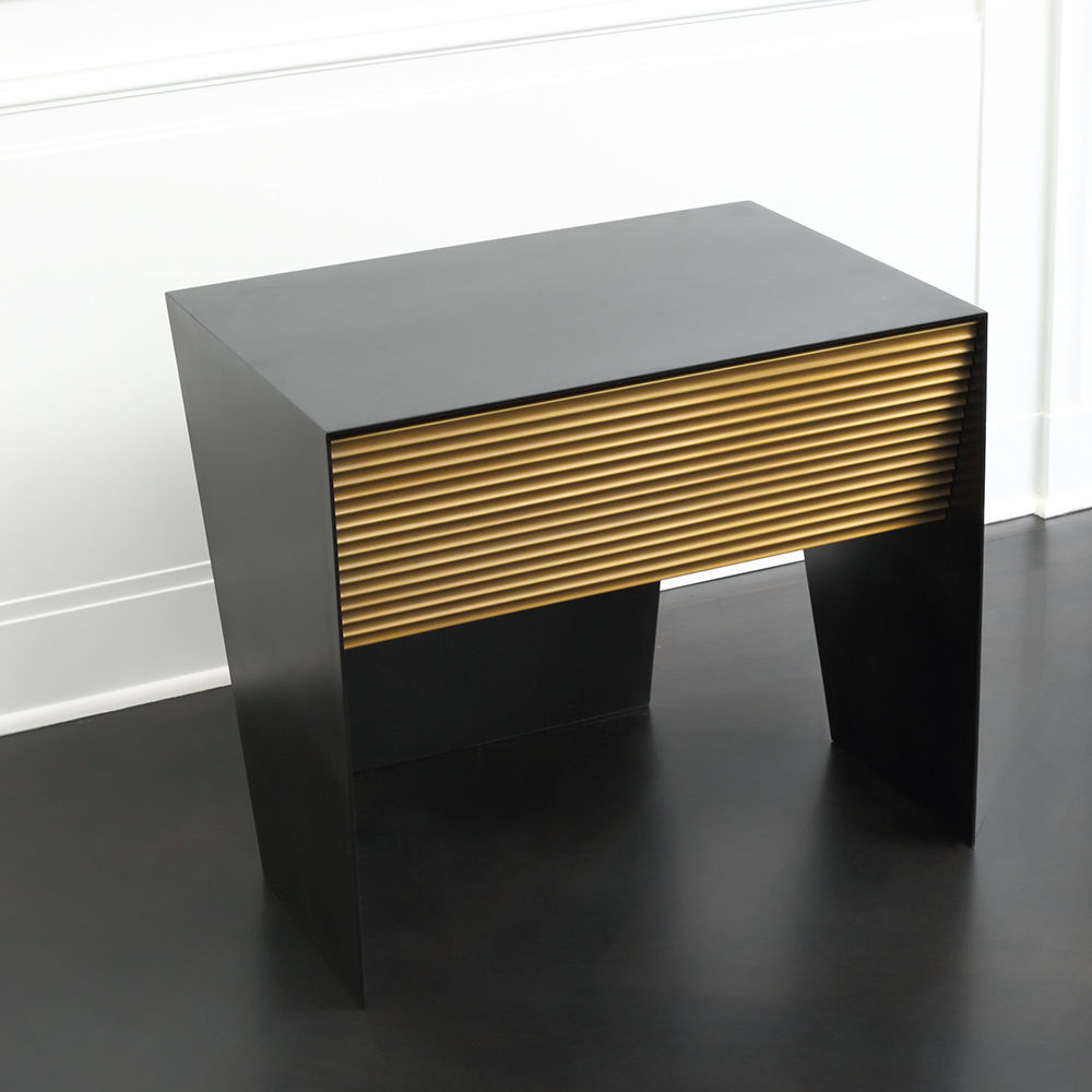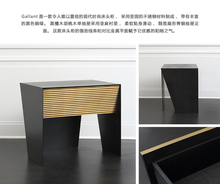 Gallant是一款令人难以置信的现代时尚床头柜,采用坚固的不锈钢材料制成,带有丰富的黑色铜绿。 黑檀木胡桃木单抽屉采用亚麻衬里,柔软贴身滑动,精致扇形青铜抽屉正面。 这款床头柜的强劲线条和对比金属平面赋予它优雅的阳刚之气。