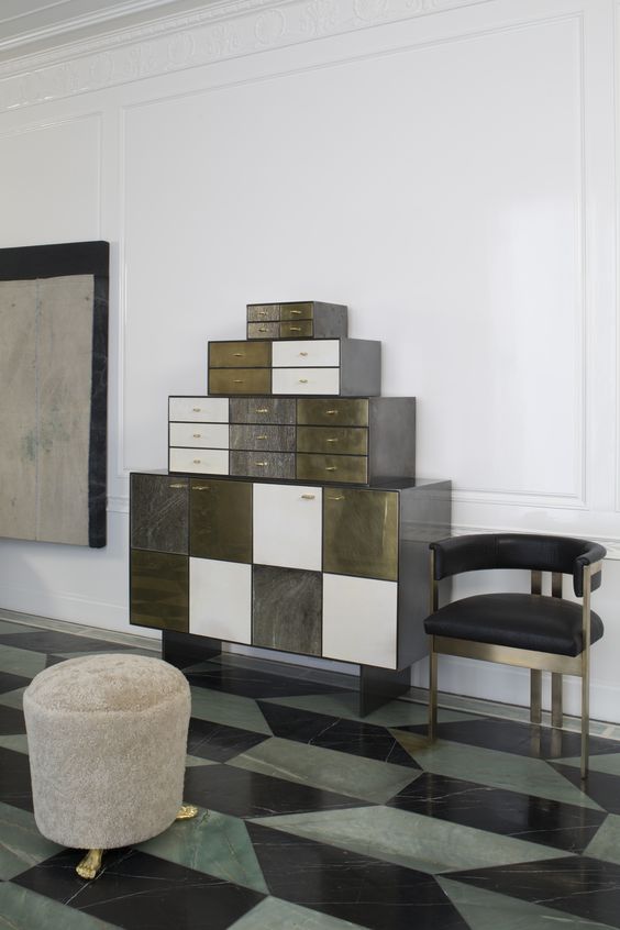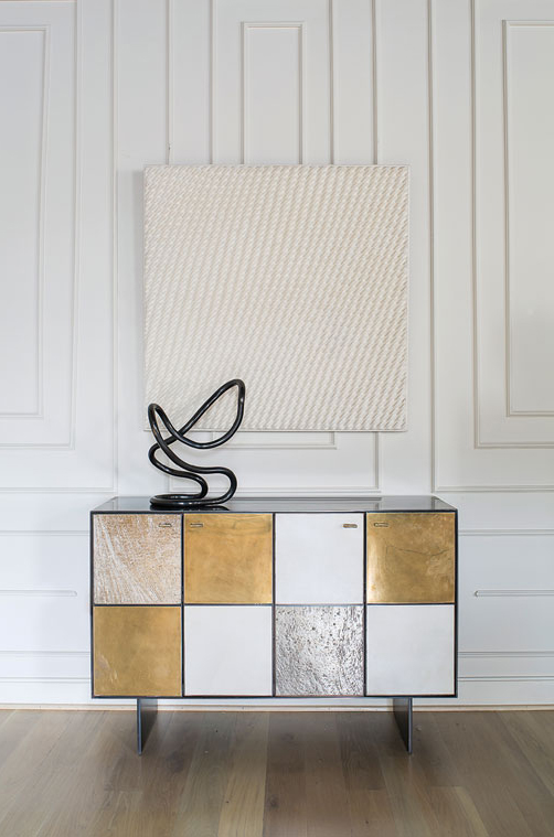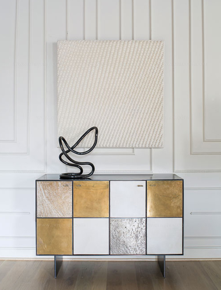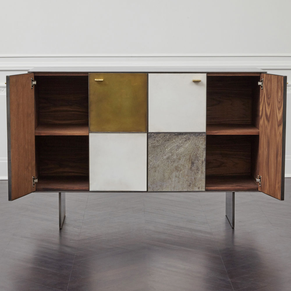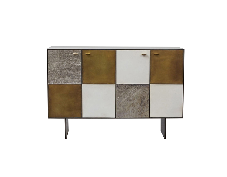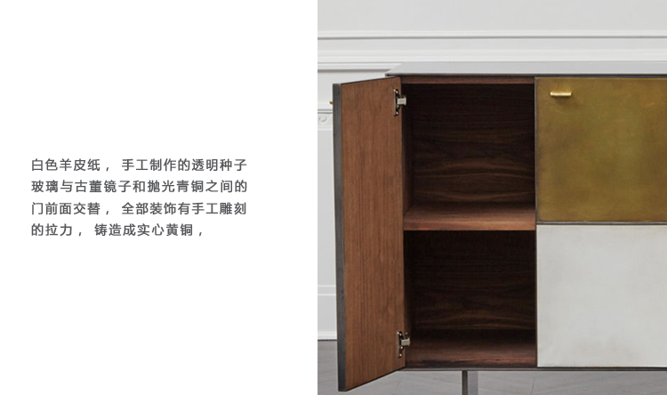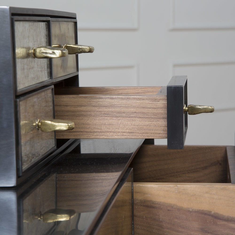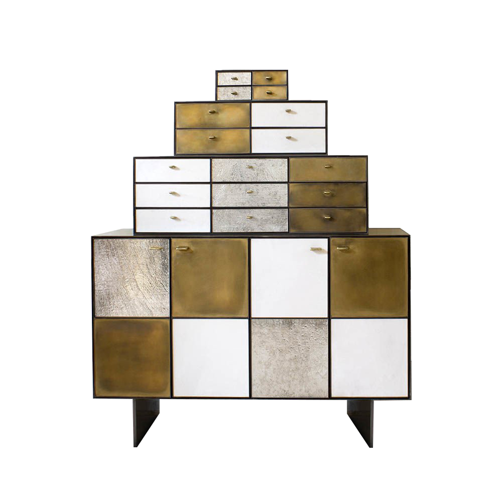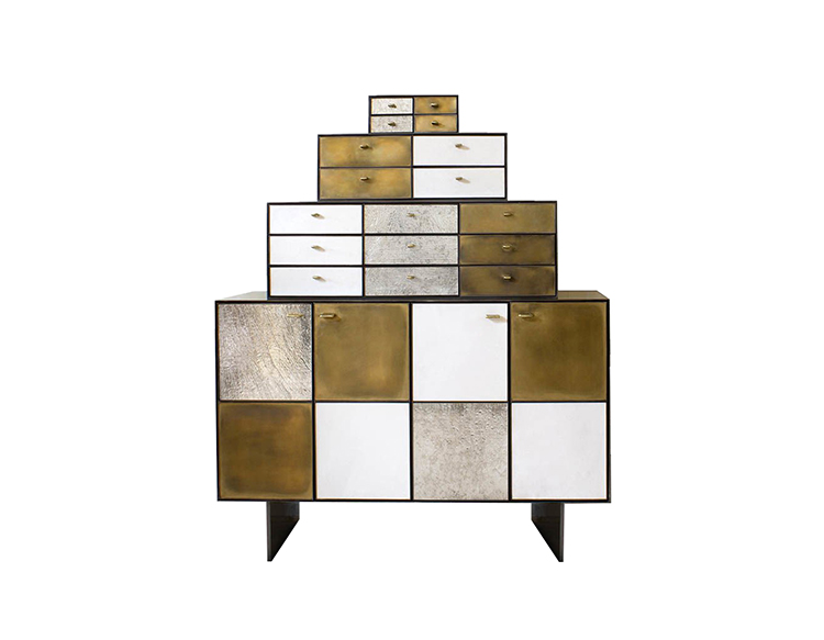 Huntley Cabinet(亨特利柜)是由黑色不锈钢机身和美丽的美国胡桃木内饰组成。在操作台部分的四扇门后面,一个可移动的内部搁架显露出来,而堆叠的金字塔形状以传统燕尾滑动抽屉为特色。 白色羊皮纸,手工制作的透明种子玻璃,古董镜子和抛光青铜,抽屉和门前面交替,全部装饰有手工雕刻的拉链。