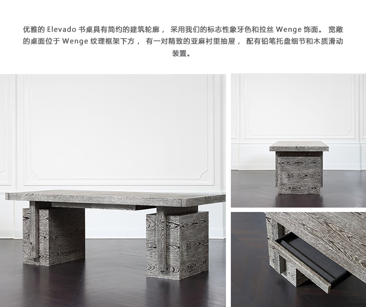 优雅的Elevado书桌具有简约的建筑轮廓,采用我们的标志性象牙色和拉丝Wenge饰面。 宽敞的桌面位于Wenge纹理框架下方,有一对精致的亚麻衬里抽屉,配有铅笔托盘细节和木质滑动装置。