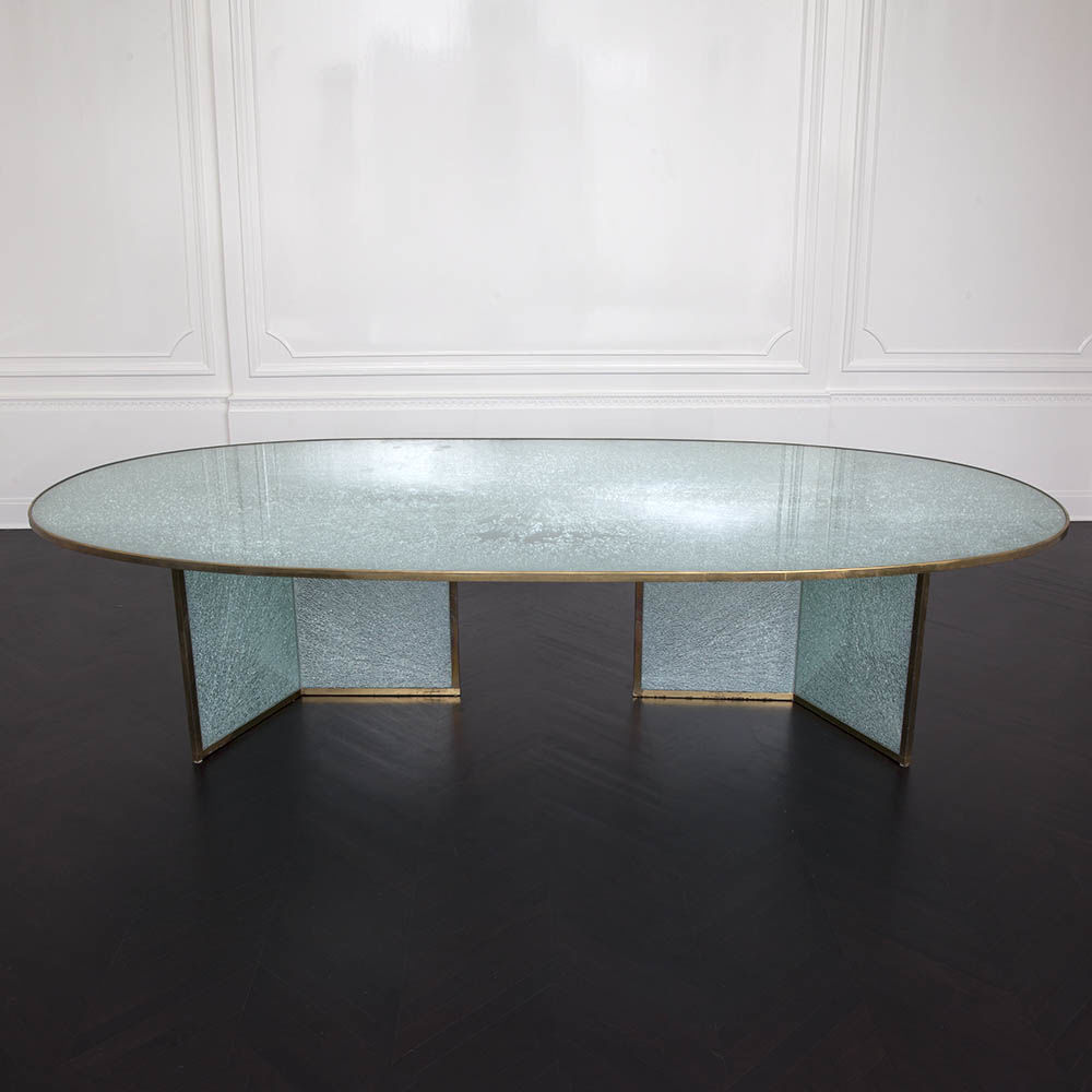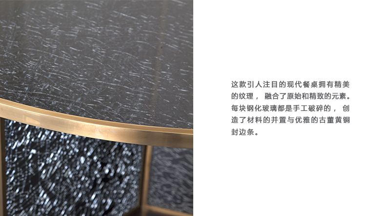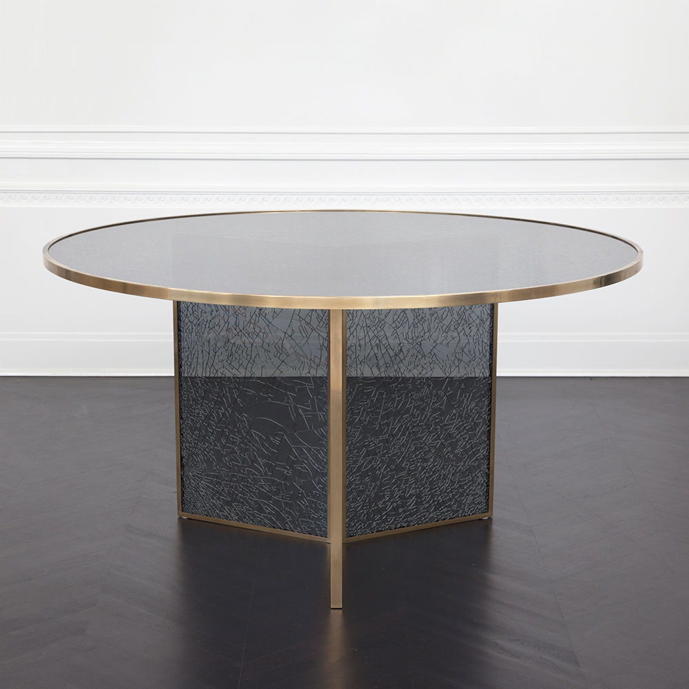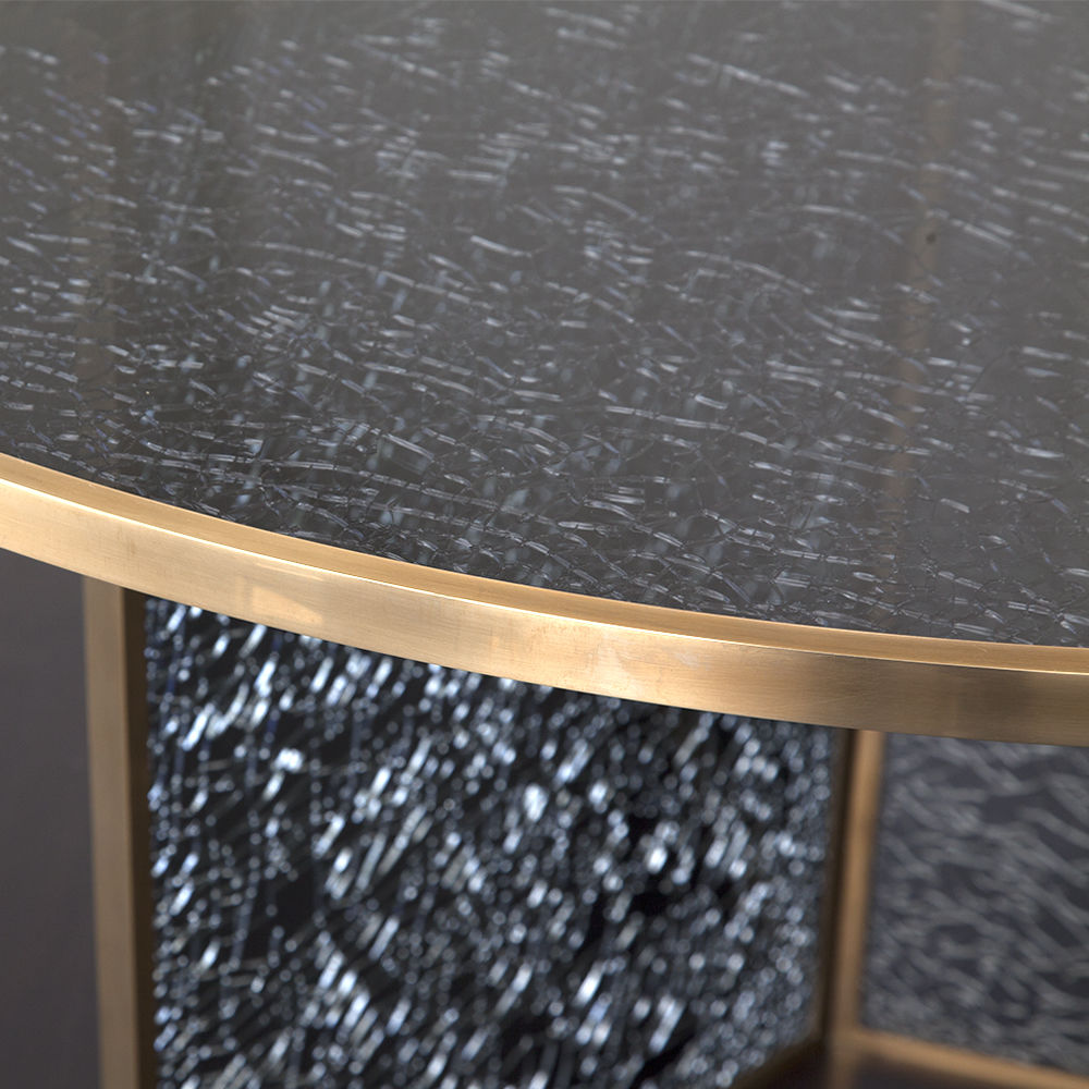 这款引人注目的现代餐桌拥有精美的纹理,融合了原始和精致的元素。 每块钢化玻璃都是手工破碎的,创造了材料的并置与优雅的古董黄铜封边条。