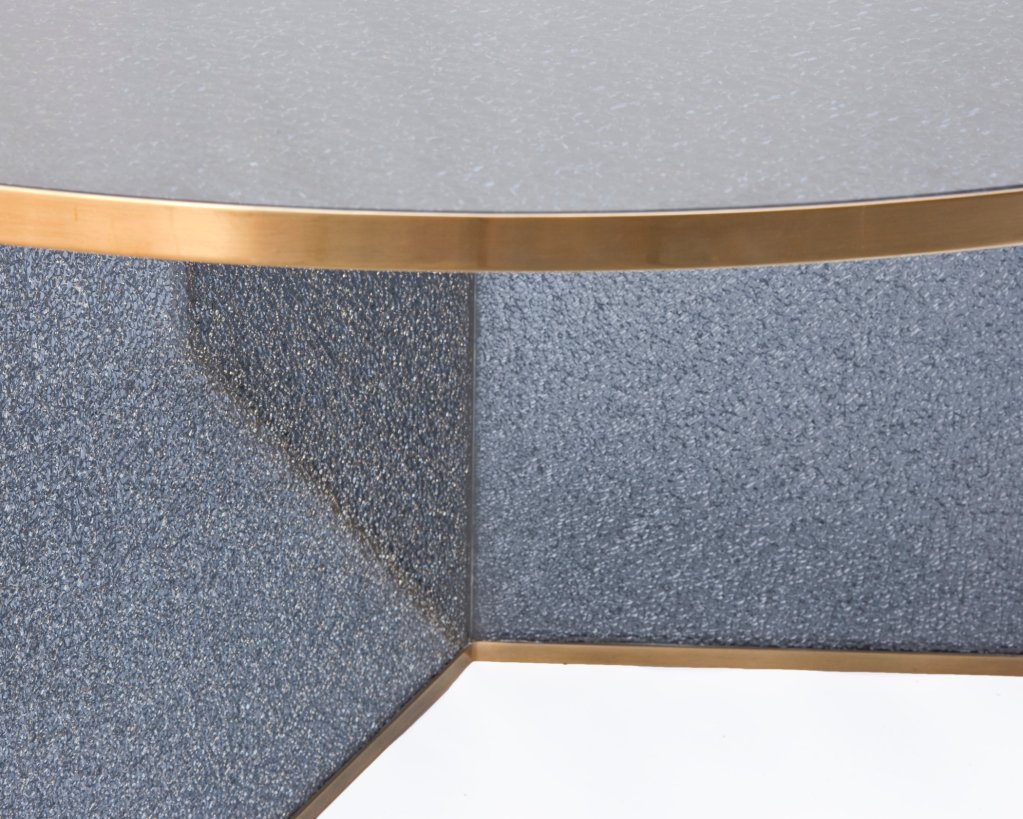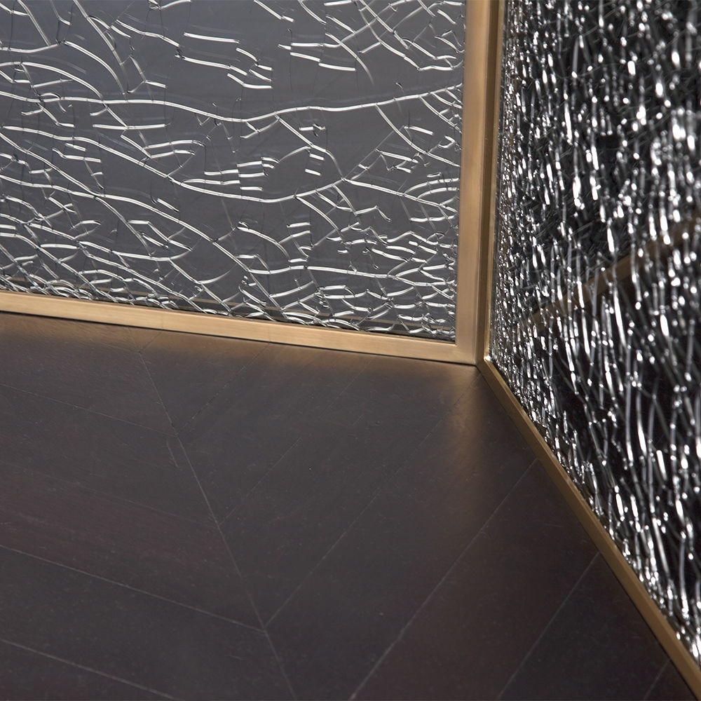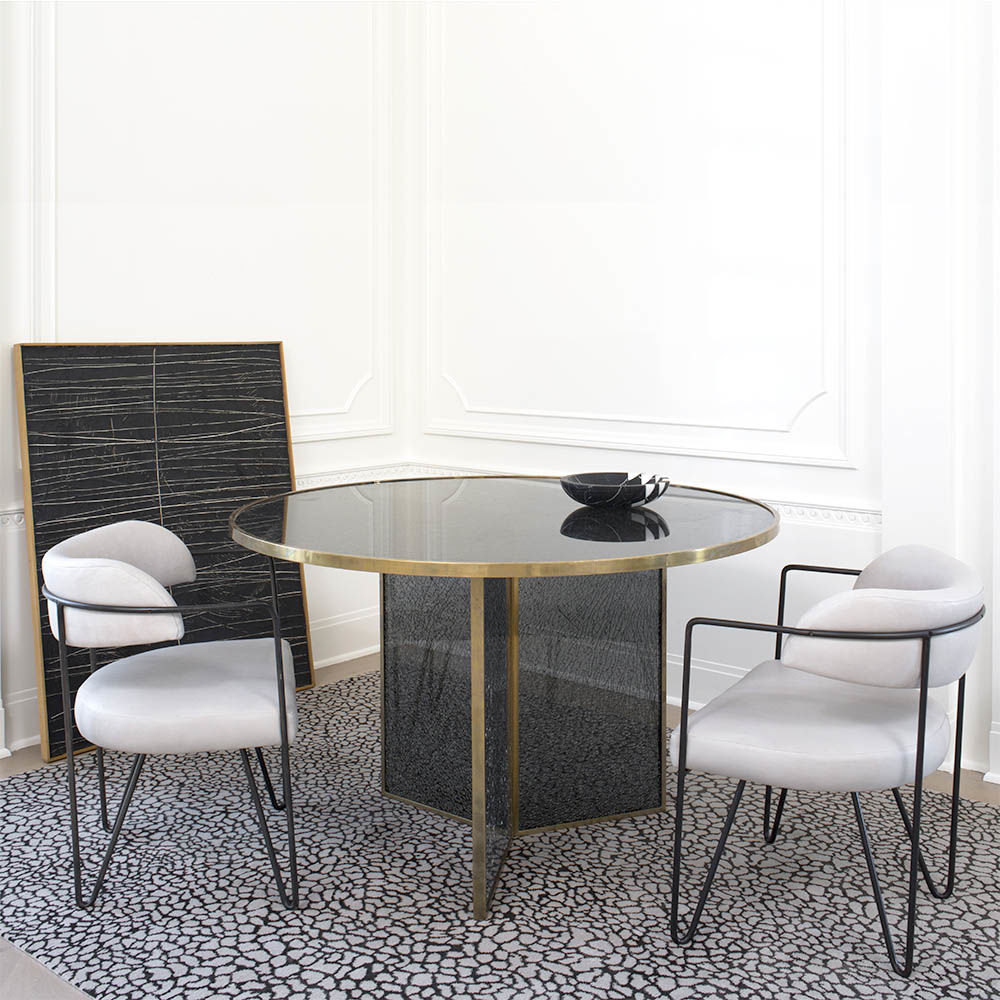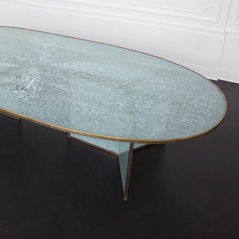 这款引人注目的现代餐桌拥有精美的纹理,融合了原始和精致的元素。 每块钢化玻璃都是手工破碎的,创造了材料的并置与优雅的古董黄铜封边条。