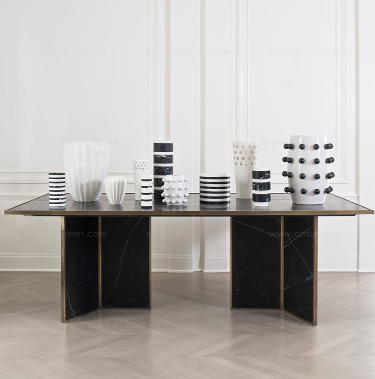 Liaison餐桌具有永恒性和现代感,又体现了凯利对混合材料的热爱。 这款优雅而简约的桌子由巨大的磨砂和密封的黑色Marquina大理石平面组成,饰有古董青铜边缘细节。