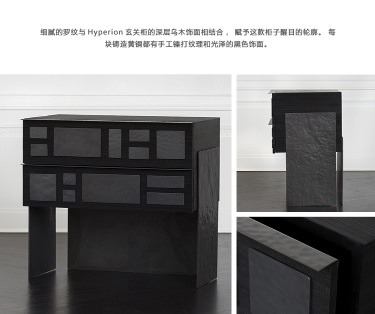 细腻的罗纹与Hyperion玄关柜的深层乌木饰面相结合,赋予这款柜子醒目的轮廓。 每块铸造黄铜都有手工锤打纹理和光泽的黑色饰面。 两个深抽屉在软关闭硬件上滑出。 这款柜子可以很容易地作为床头柜或配置在一个戏剧性的入口通道。