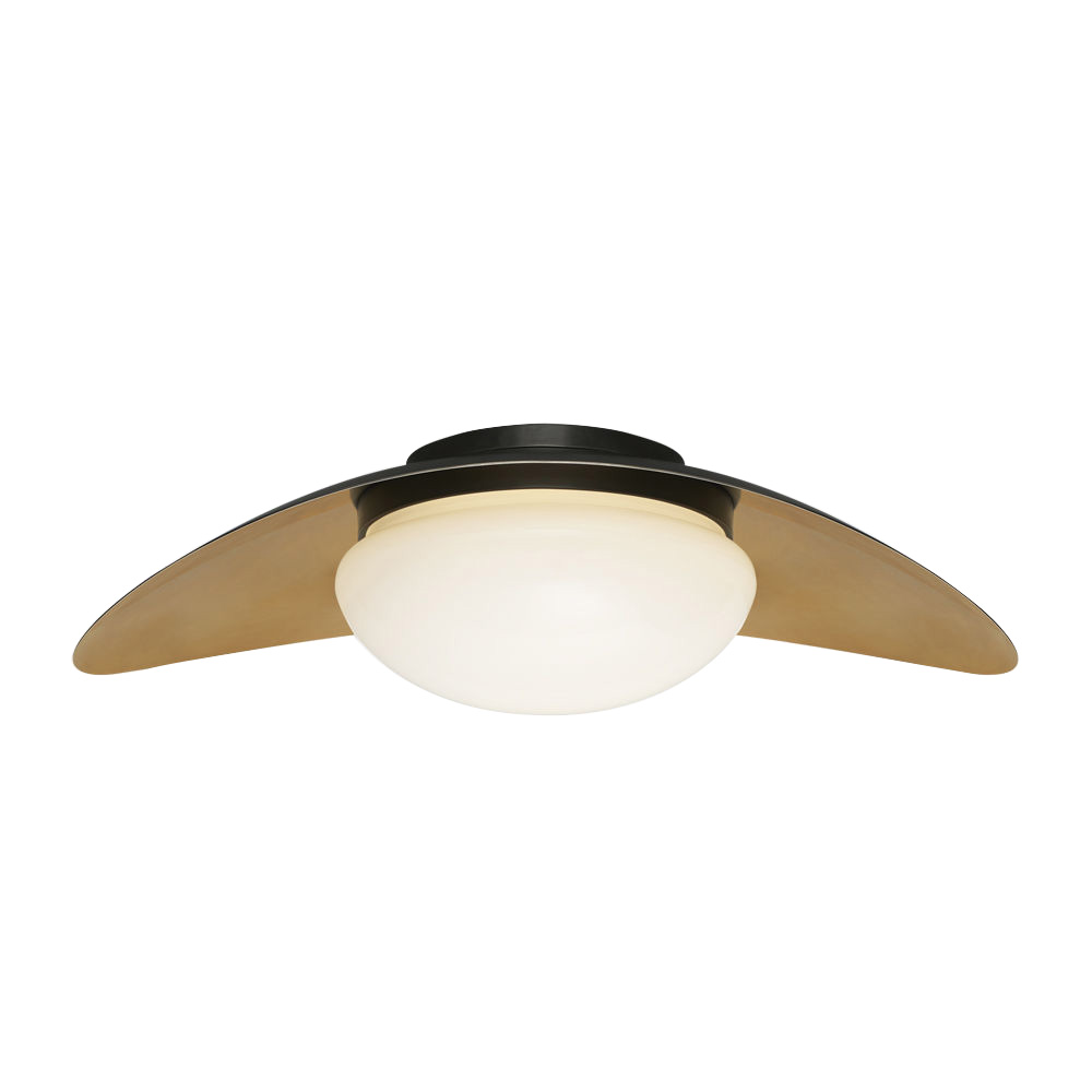 Nouvel中型吸顶灯极小而大胆,突出了混合材料和曲线形式的并置。 这款吸顶灯有古董黄铜,抛光镍或青铜和黄铜的组合,每个都有白色玻璃球。 适用于潮湿场所。