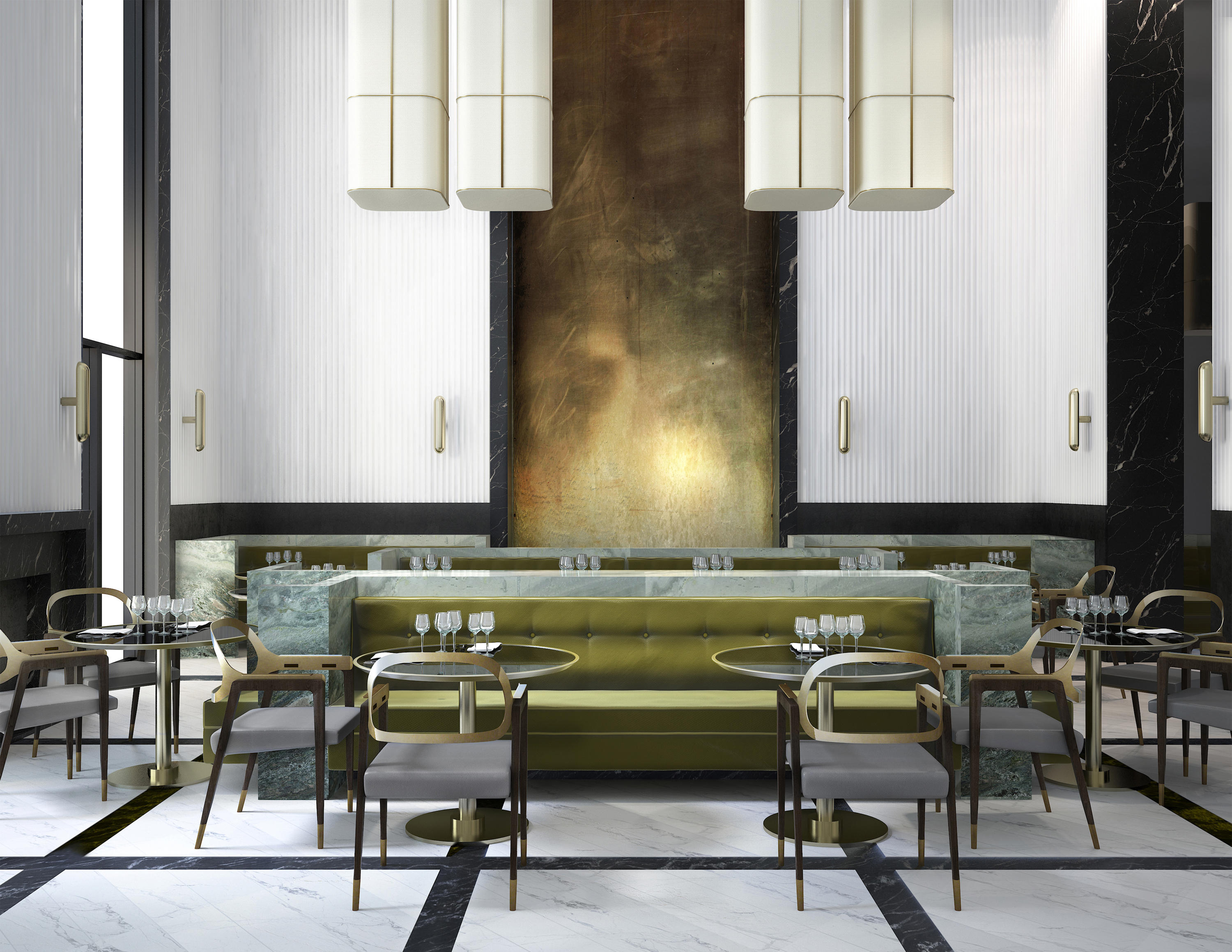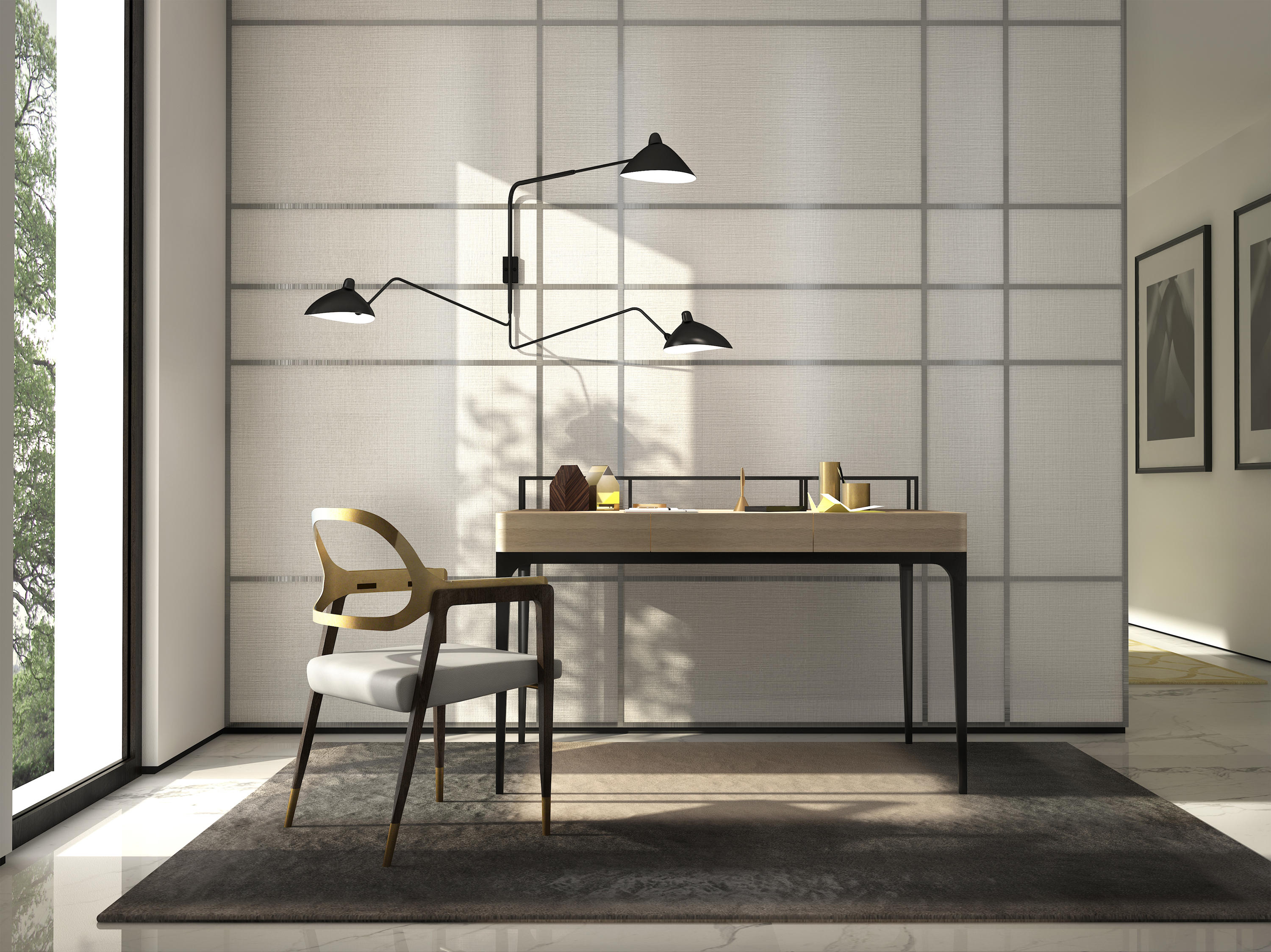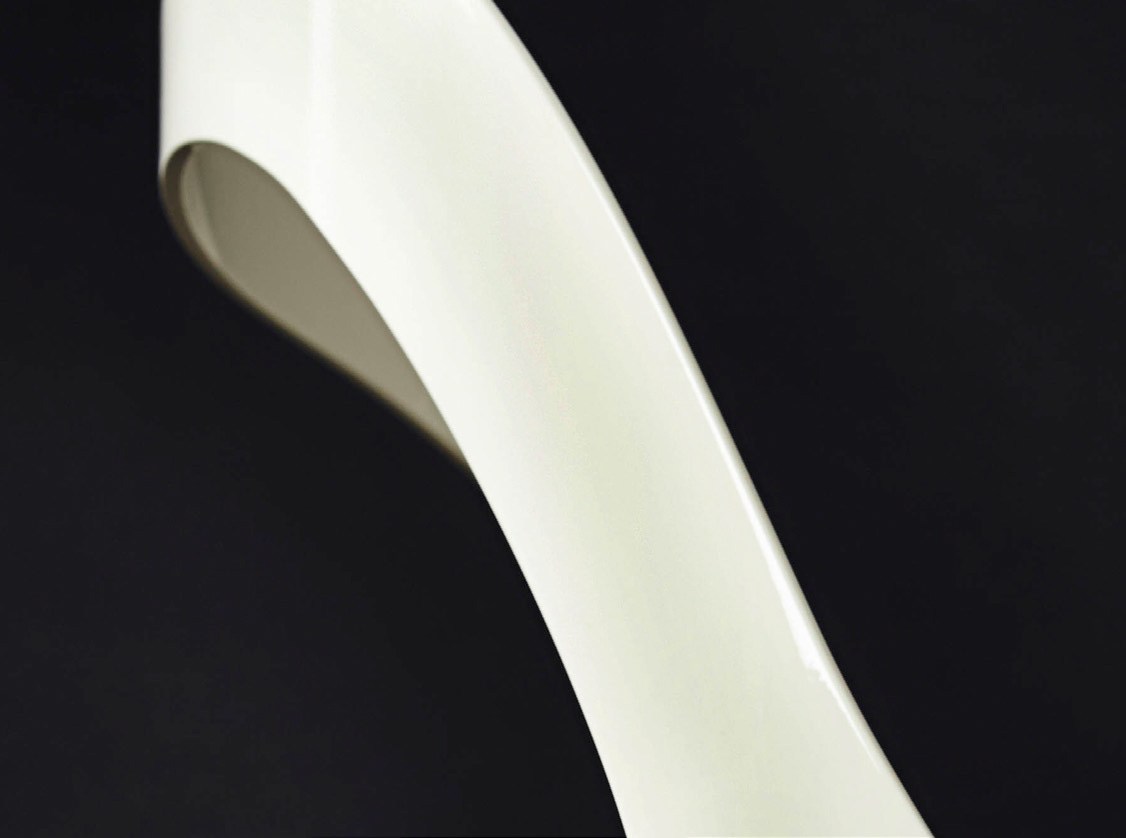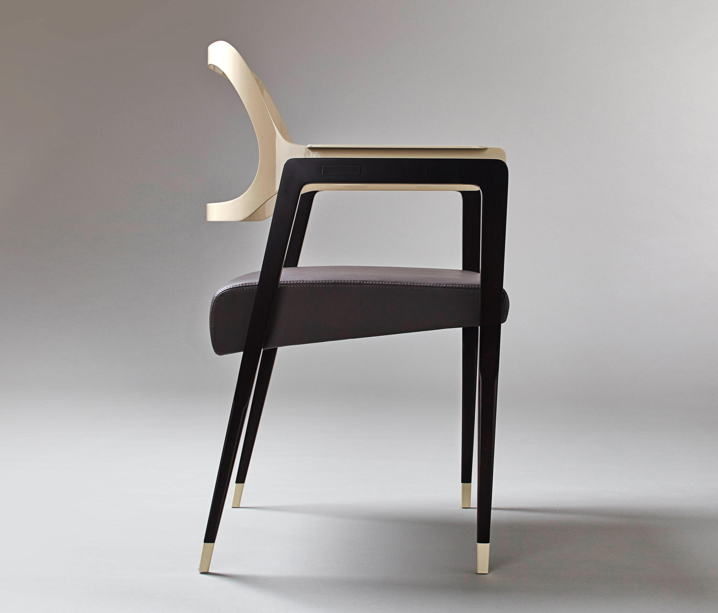 这把椅子环绕着靠背,提升了它的脚感,弯曲的轮廓,完美地融合了胡桃木贴面、皮革和抛光金属。引人注目的是比例的平衡和线条的和谐,显示出极大的优雅。有两种装修。淡奶油色真皮座椅和抛光黄铜靠背和扶手或灰色烟熏皮革座椅和象牙色金属靠背和扶手。