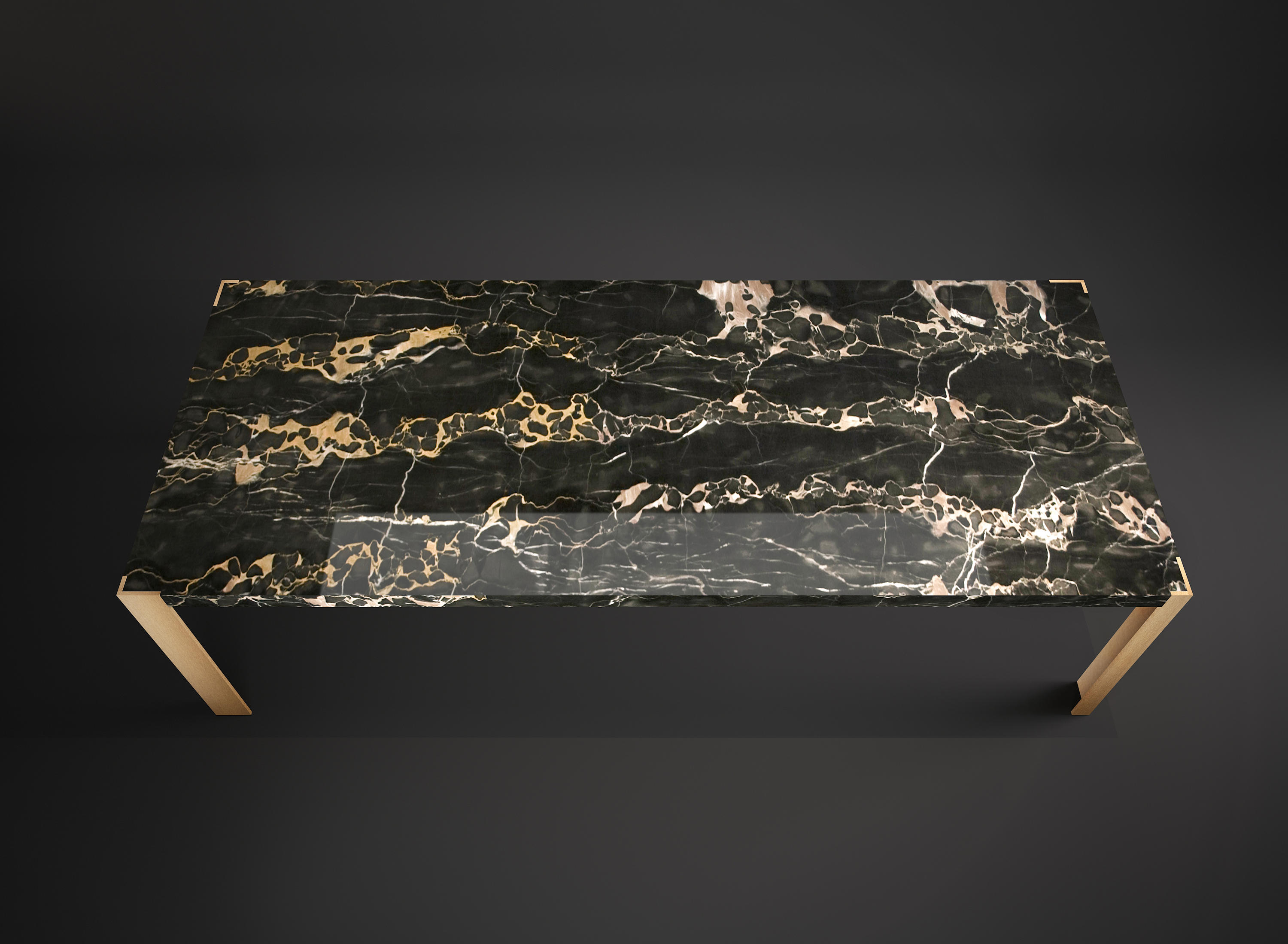 Stuart同时精致而简约,但最令人惊讶的是其结构的材质:它采用黑色大理石台面和拉丝黄铜框架。 大理石纹理的温暖阴影增强了它的清醒。