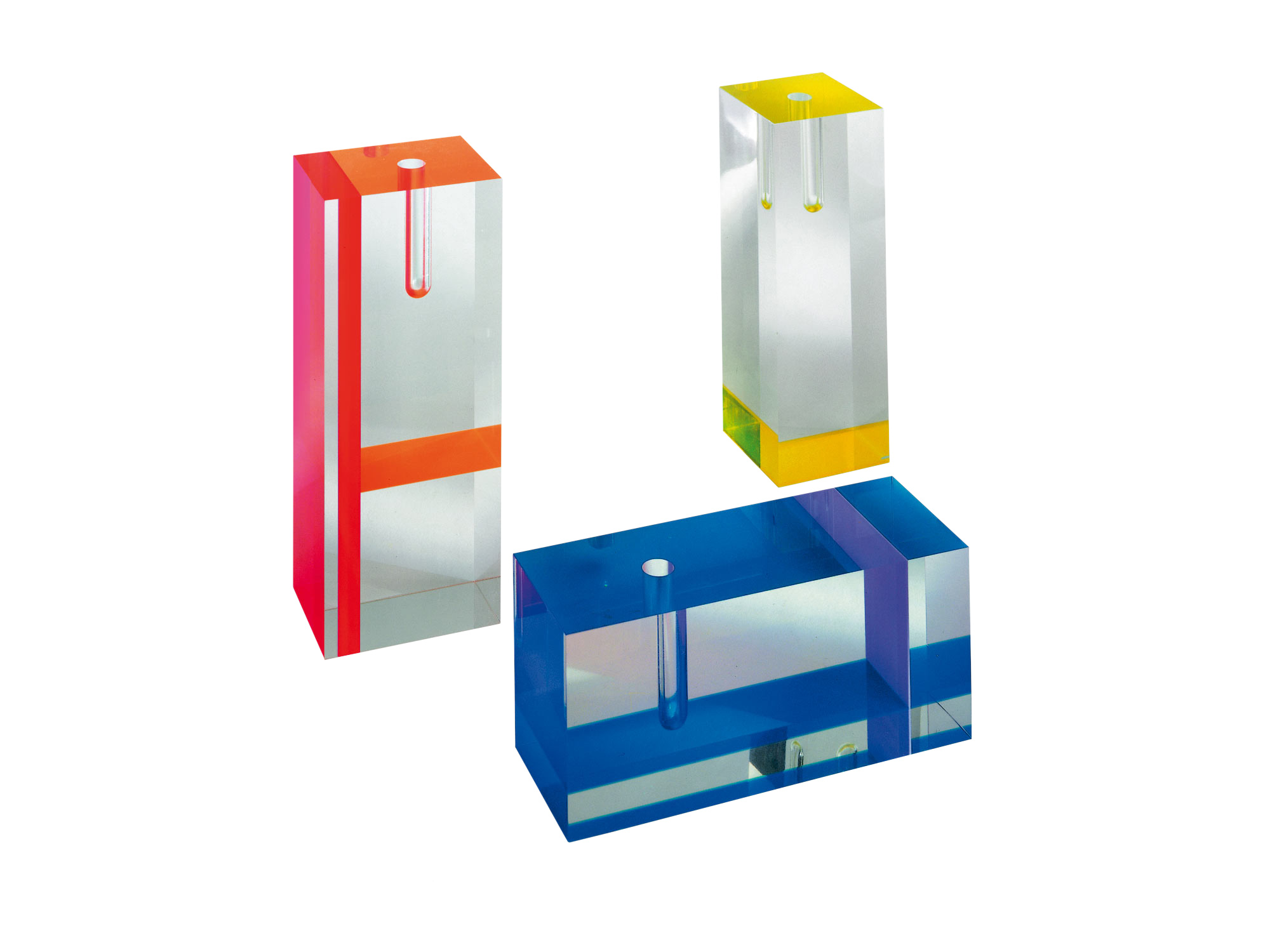 Tomoko Mizu的Acrilic Vase由有机玻璃制成,有三种不同尺寸,有颜色搭配可供选择。 透明饰面搭配彩色插页,营造出具有明显几何风格的装饰:红色/橙色,荧光黄色和蓝色/紫色。