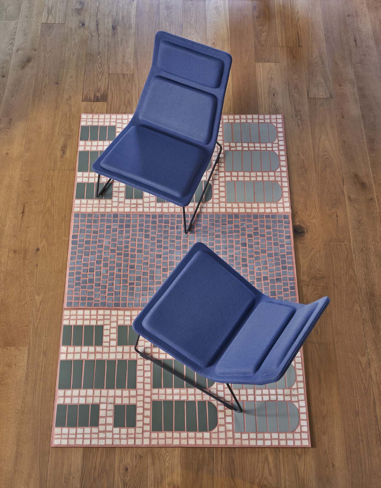 一块马赛克地毯,庆祝米兰阿伦加里奥宫殿80周年及其由建筑师Portaluppi、Muzio、Magistretti和Griffini签署的项目。 在建筑立面上再现不对称几何形状的相同大理石砖被投射在非织造织物上。