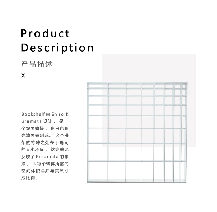 Bookshelf由Shiro Kuramata设计,是一个双面模块,由白色哑光漆面板制成。 这个书架的特殊之处在于隔间的大小不同,这完美地反映了Kuramata的想法,即每个物体所需的空间体积必须与其尺寸成比例。在这件作品中,极端的视觉亮度与净的坚固性相结合。