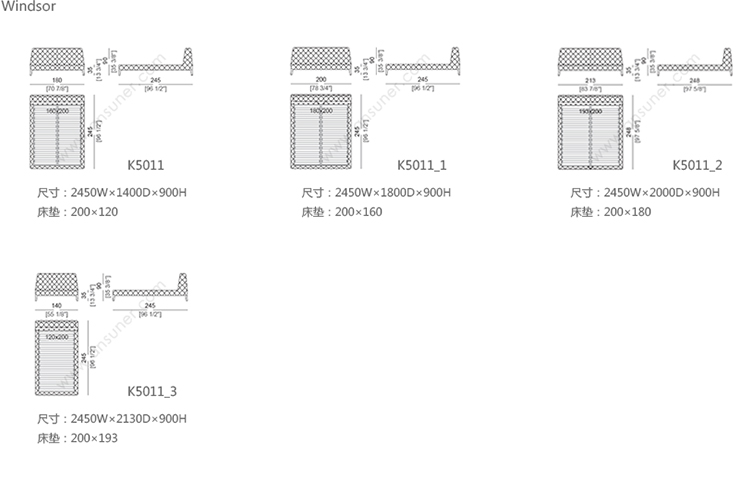 Windsor bed 系列尺寸/示意图