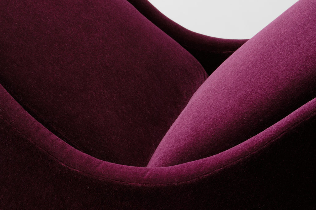 这款Sloop座椅采用Aubergine马海毛制成,配有黄铜指甲油和坚固的美国黑胡桃巧克力黑檀木腿。