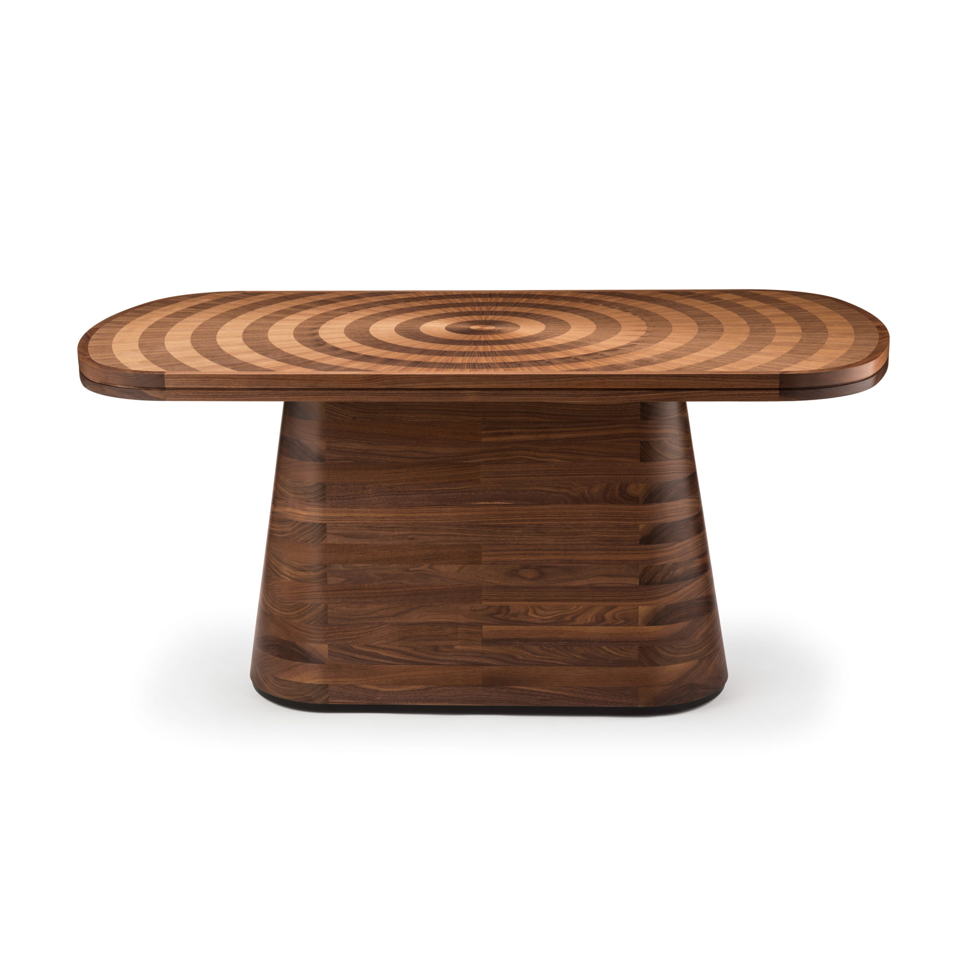 光芒四射的浅色和深色胡桃木饰面突破了我们超凡脱俗的Astral餐桌的表面,它们的生命环仅由坚实的胡桃木装饰和锚固基座限制。