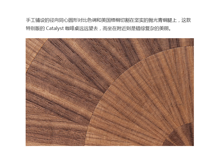 手工铺设的径向同心圆形对比色调和美国梧桐切割在坚实的抛光青铜腿上,这款特别版的Catalyst咖啡桌远远望去,而坐在附近则是错综复杂的美丽。