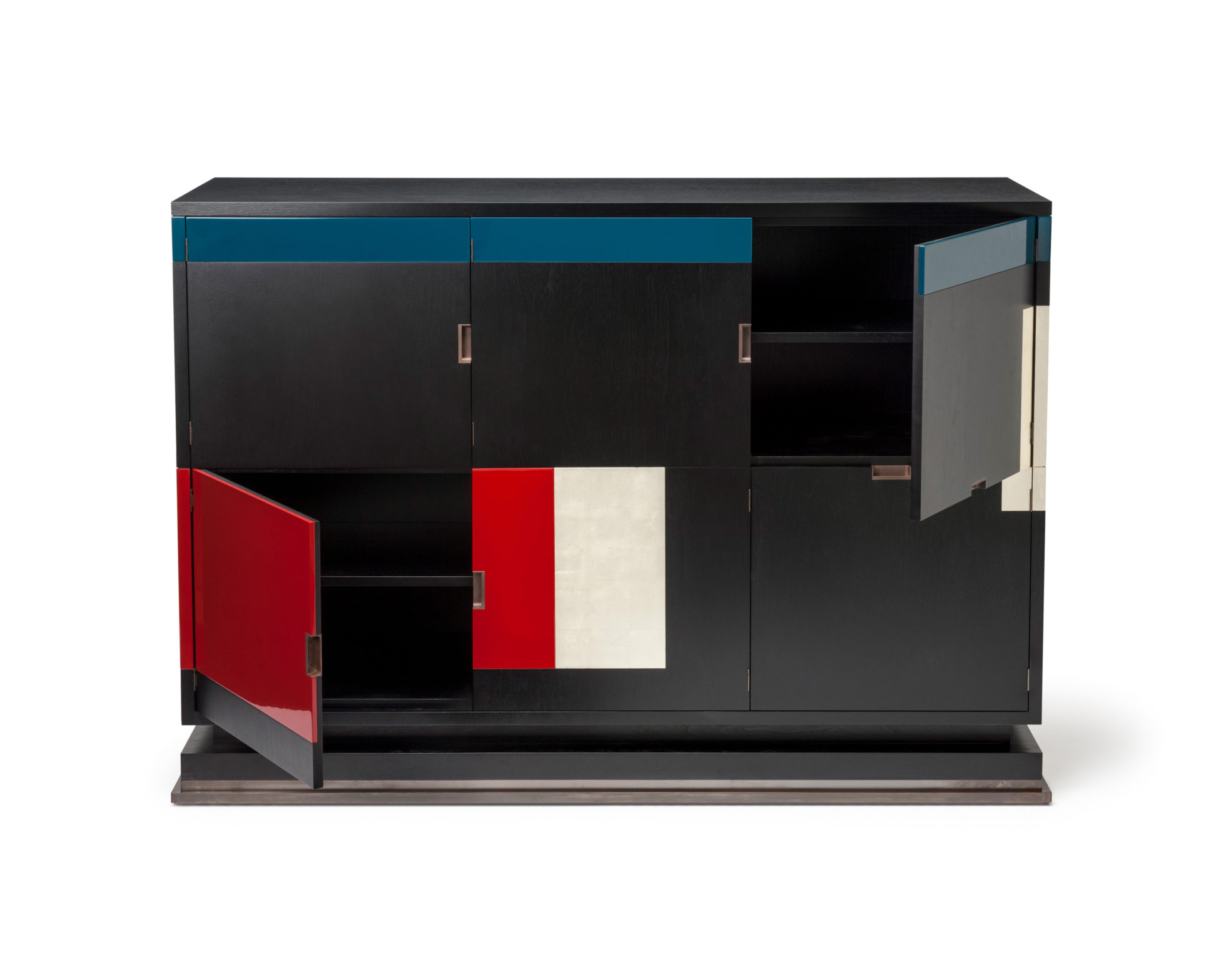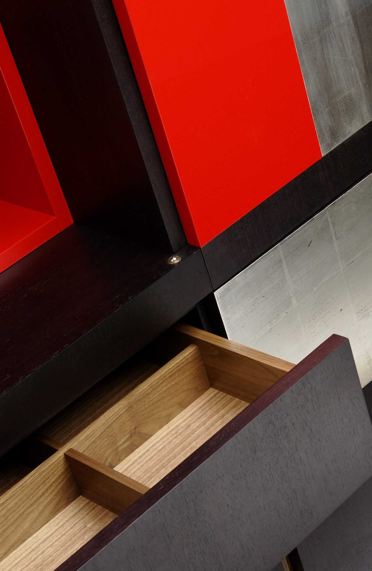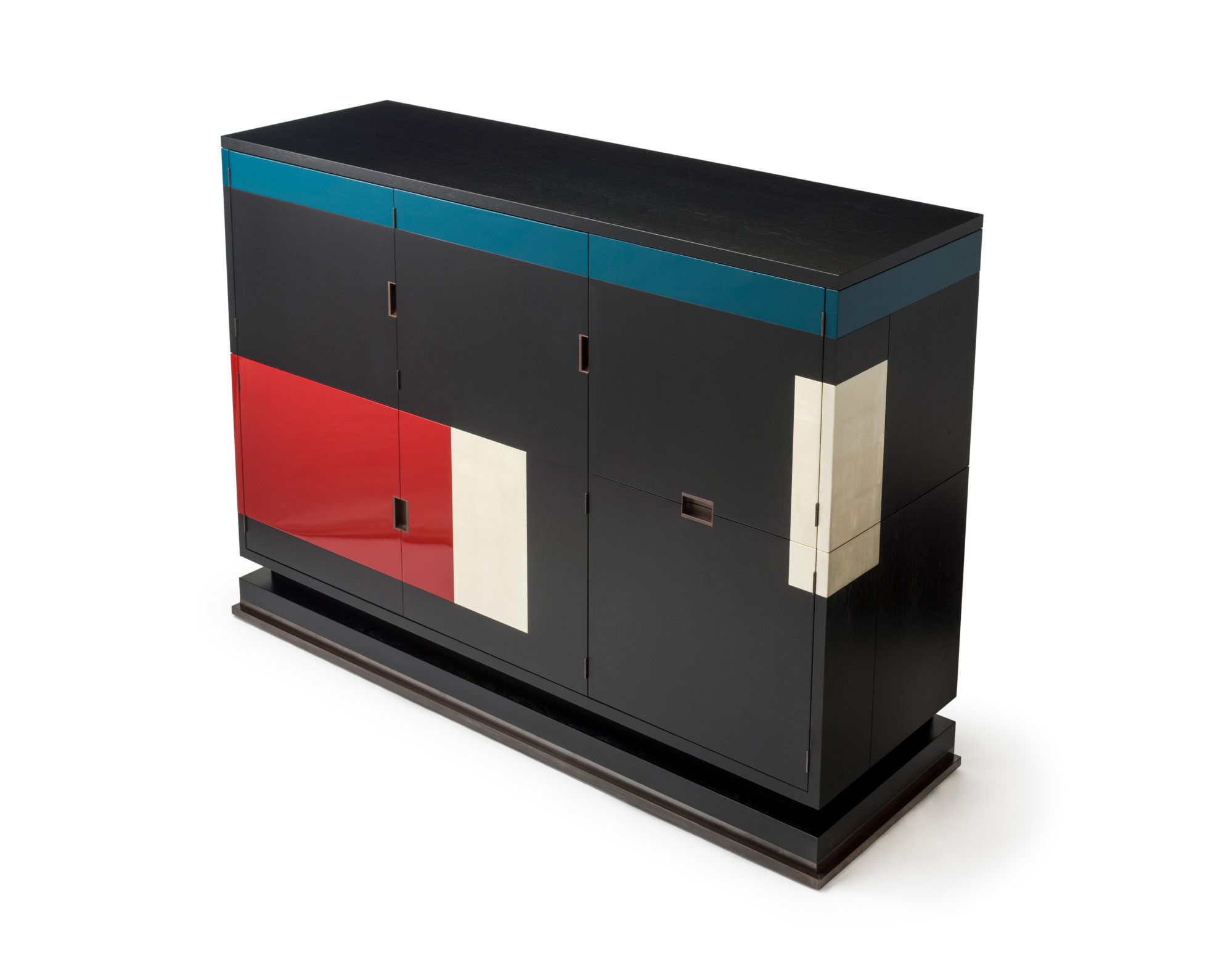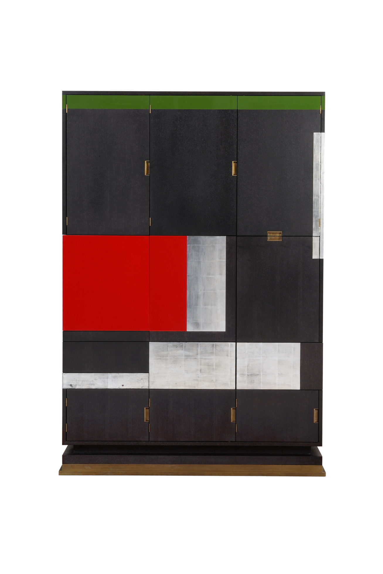 美式黑胡桃黑色饮料柜,带多个抽屉和门。 高光红色和绿色漆,白金叶和黄铜色的细节。 内置橱柜门定制手柄和实心黄铜铰链。 最好的杂技橱柜制作。