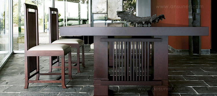 靠背椅,采用天然樱桃木、樱桃木色或黑色胡桃木制造。座垫采用聚氨酯海绵填充,皮革及布艺面料软包。