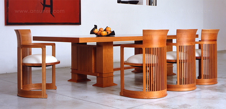 曲背餐椅,采用天然樱桃木、樱桃木色或黑色的胡桃木制造。塑料座面采用聚氨酯海绵和喷胶棉填充。座面软包为皮革或布艺面料。