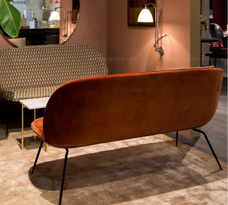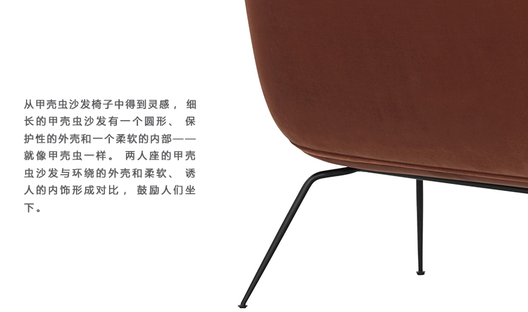 从甲壳虫沙发椅子中得到灵感,细长的甲壳虫沙发有一个圆形、保护性的外壳和一个柔软的内部——就像甲壳虫一样。两人座的甲壳虫沙发与环绕的外壳和柔软、诱人的内饰形成对比,鼓励人们坐下。