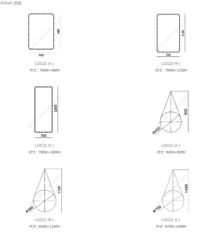 Adnet集合由一个圆形和一个矩形镜组成,矩形镜在S, M和L中出现。