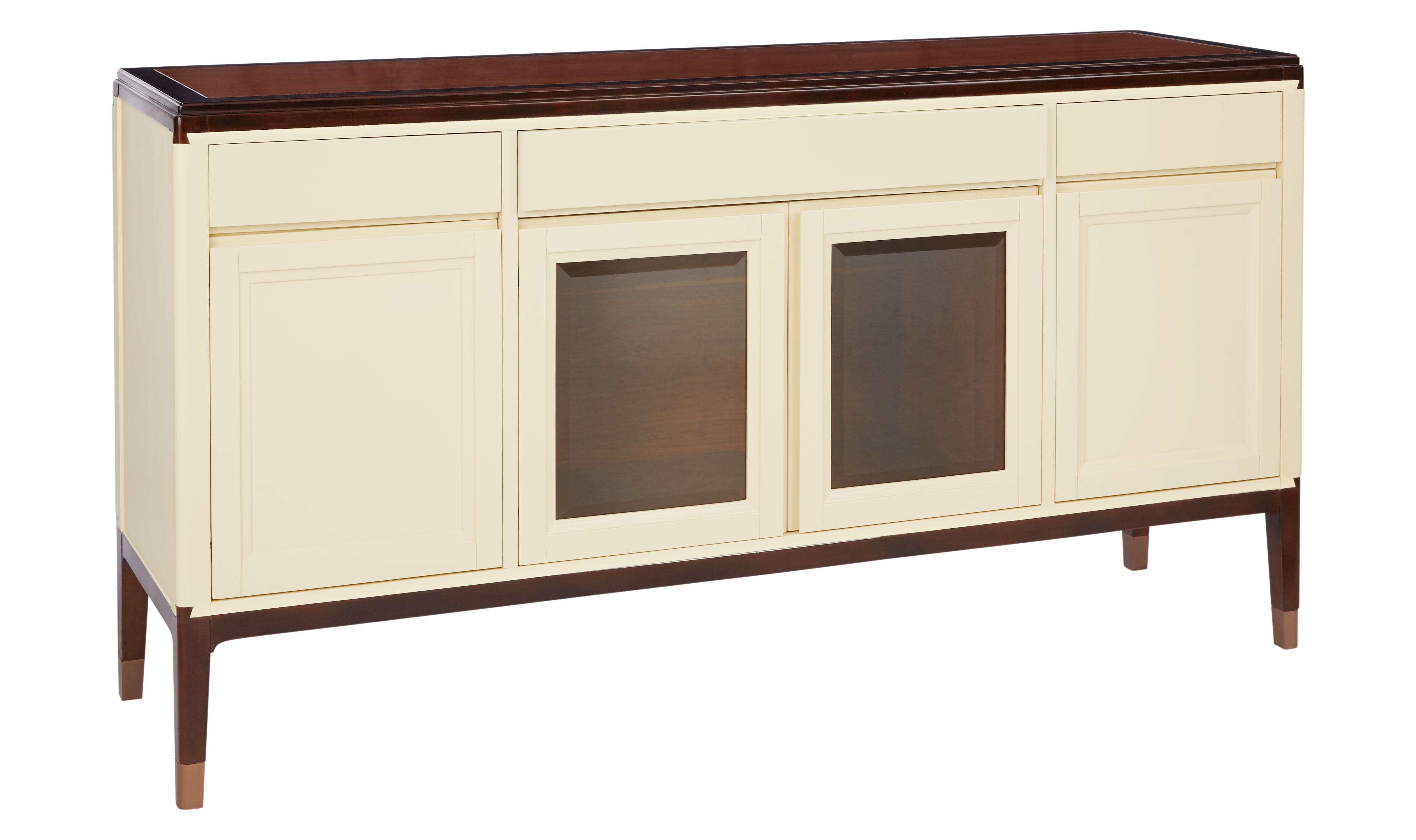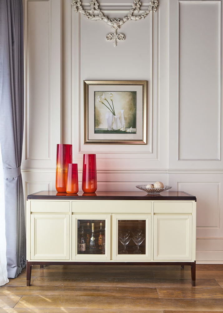 采用燕尾榫造型的拉手,符合成年人手型,不费力即可轻松打开;进口隐藏式铰链;铜脚,赋予中式韵味的同时以防磨损。直线的简洁设计具有超强的收纳功能,备餐台抽屉刀叉盘区域划分合理,实用易搭。