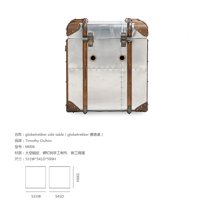 "慵懒、我行我素、精致、时尚,还有那么点怀旧的味道,Timothy Oulton家居的产品就是用这些无可替代的特点,征服了各国的英伦家具爱好者们。重提浪漫时代的长长的豪华海上航行,Globetrekker 系列的灵感来自Timothy Oulton于1914年在一个古董市场发现旅行箱,他深深的被复杂细节和美丽的黄铜板的旅行箱迷住了,Oulton拆解了那个古色古香的旅行箱并进行重新设计出一系列作品,它涵盖的灯表、 箱子、 咖啡桌和书柜等集合。捕获真正的魅力,还原精致工艺的旧古董皮箱的精髓,通过怀旧的贴纸饰面样式,采用老木、优质的老式皮革和黄铜铰链,通过精湛的手工处理完成了这套系列。