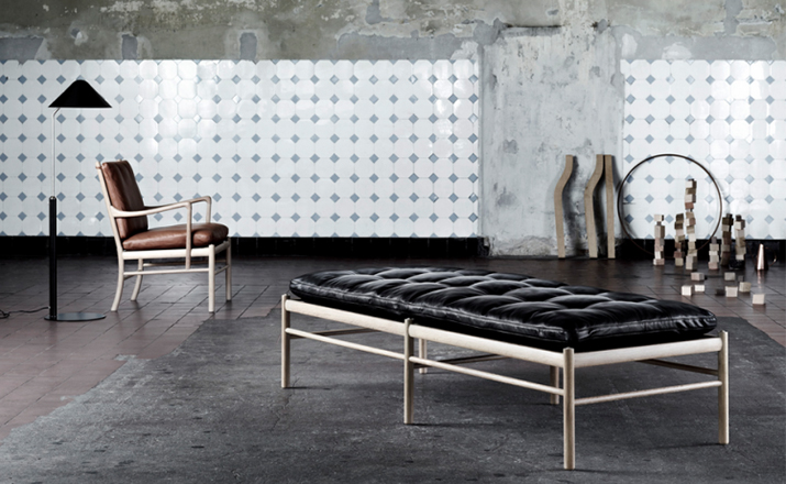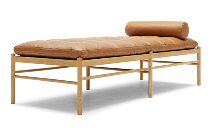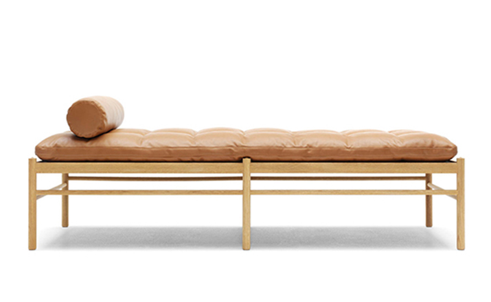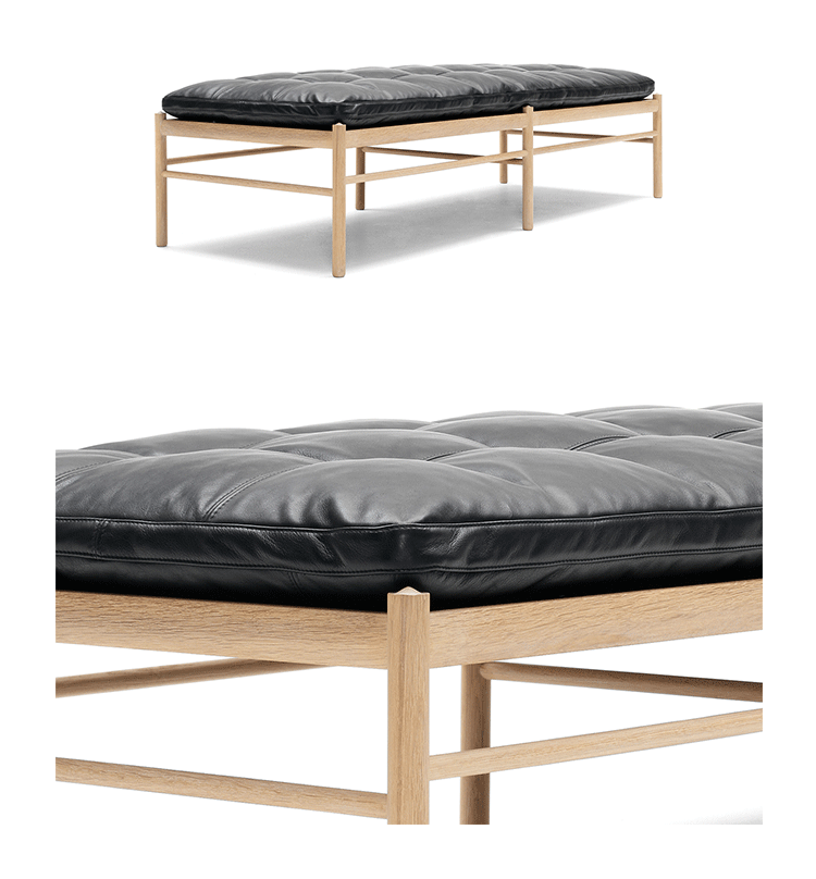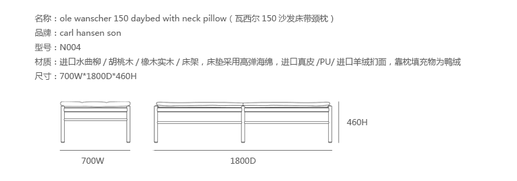 "OW150 is a timeless and elegant daybed with simple forms finished to the very highest standards.Slim dimensions and resilient forms are haracteristics of Ole Wanscher's designs.Classic and yet singularly modern at the same time.The seat is made of hand-woven stretched cotton webbing in black,attached to a solid wood frame.The cushions consist of down molded cold foam,upholstered in your choice of fabric or leather.Matching neck pillow is also included.Cushion is not turnable."