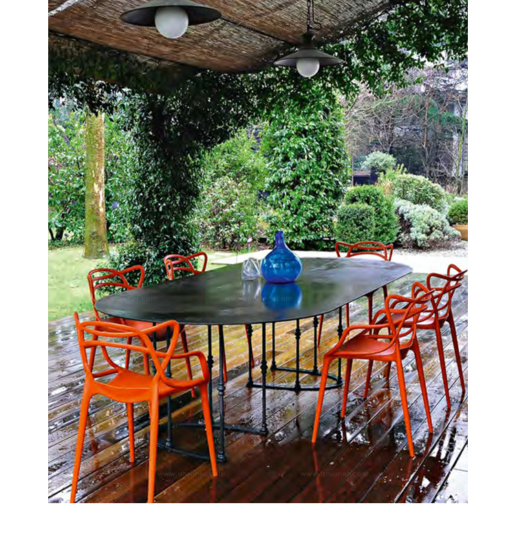 Masters Stacking Chair(大师叠椅)是大名鼎鼎具有鬼才之称法国籍天才设计师Philippe Patrick Starck的家具设计作品,Good Design Award 2010 和 Gold Dot Award 2013的获奖作品,至今,仍为业内人称赞和追逐,是一把收藏价值较高的经典椅。其给人感觉是由3根藤缠起来,4根细长的腿,看起来椅子很宽敞,很舒适,较其他椅子,它很独特;当然,它还非常坚固,你不需要担心它是否能承受一个人的重量。这款椅子外观别具一格,事实上,它是独特和清新的结合体;Masters椅由纤细椅腿作支撑,座位空间很大,并且舒适感极强。这款椅子最吸引人的是其特殊的椅背,三个不同靠背向下延伸,在椅座处融合,形成柔美的交叉线条,从而打造出丰满而空灵的空间感。Masters椅实用、舒适、易于叠放。