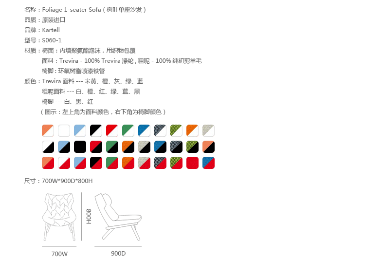 在西班牙鬼才设计师Patricia Urquiola的工作与美学中,大自然与人造是不变的主题,树叶沙发系列很好的表现了她的价值观,柔软的座椅,树叶造型,体现着生态与环保,尤其适合家庭使用。这套家具有单座或者双座,造型非常自然生态︰ 图漆金属框架,舒适的座位,树叶造型缝线,时刻让人联想到一棵枝繁叶茂树。椅面才有舒适的布料或者纤维织物和羊毛混纺,椅脚为环氧树脂喷漆铁管。通过活泼的色彩革新的材料,精湛的缝纫工艺完成了一把具有很高潜在表现力的椅子。