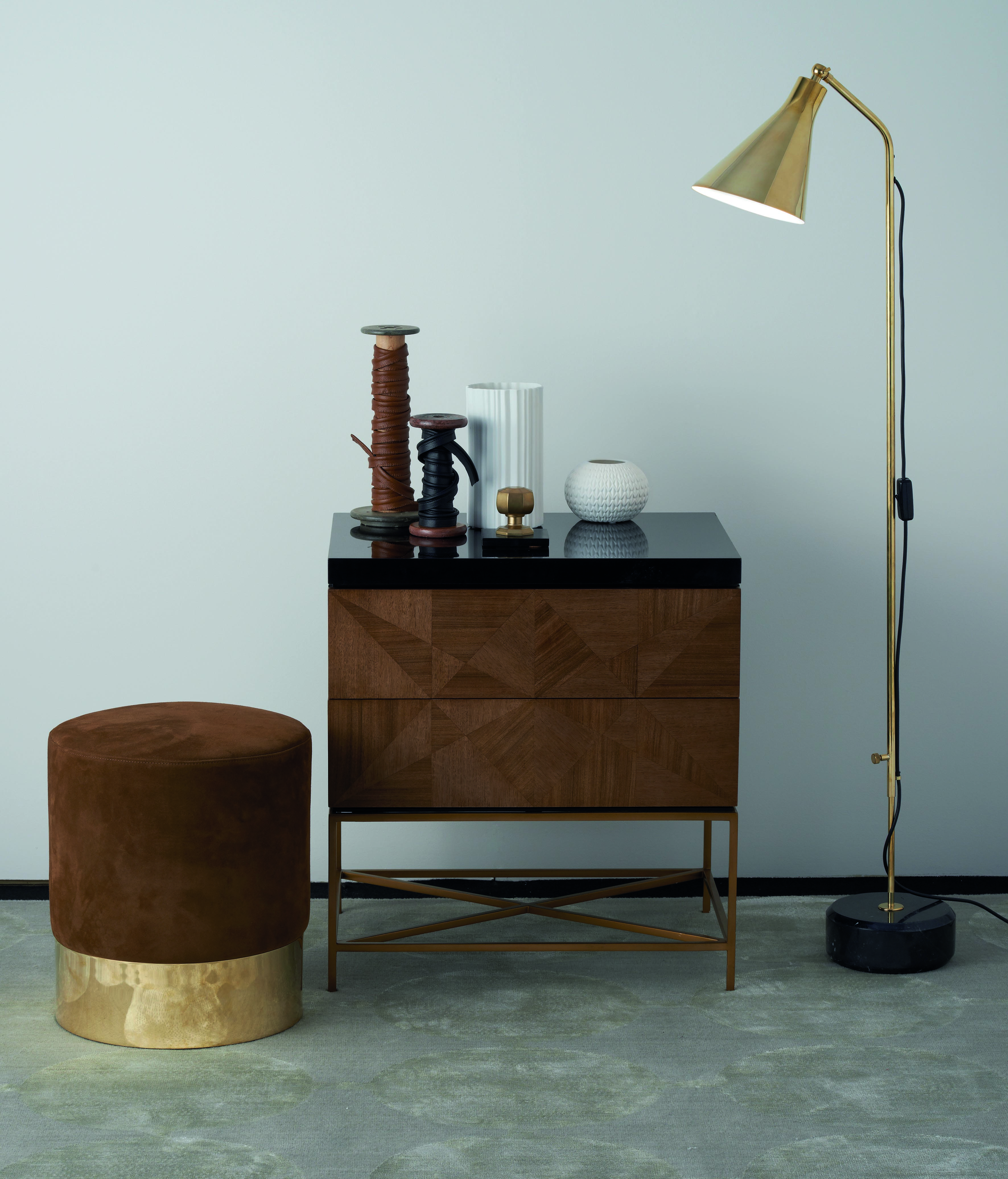 Azucena的凳子在Raf Simons Kvadrat纺织品上装饰。黄铜底座。1963年由Luigi Dominioni设计。Azucena的当代作品。