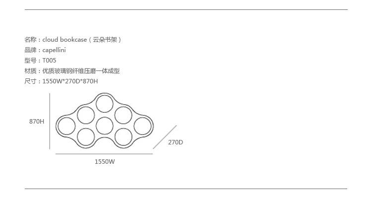 Cloud Bookcase(云朵书架)是一个模块化、 双面书架,由白色聚乙烯材质做成(颜色可选),由Ronan & Erwan Bouroullec兄弟两设计的。书架元素使用旋转技术制造而成,可水平或垂直放置,可单独使用或多套组合,看起来就像一朵云彩。Cloud Bookcase(云朵书架)恰如其名,将整体书架的形貌,刻画地有如云朵一般,飘逸而动感,双面相同设计,运用玻璃钢高塑性的材质优点,带来耐用而前卫的作品风貌。每一件书架均为八孔设计,书架与书架间可相互接合,重叠搭配,带来更多色彩,更多形貌的设计可能。